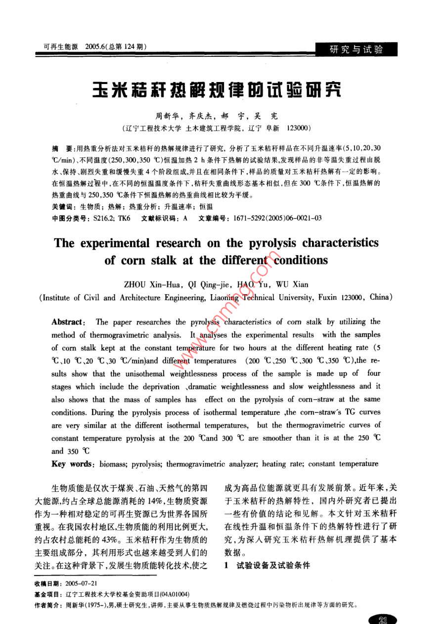 玉米秸秆热解规律的试验研究