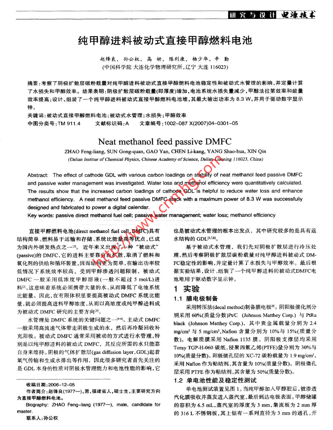 纯甲醇进料被动式直接甲醇燃料电池