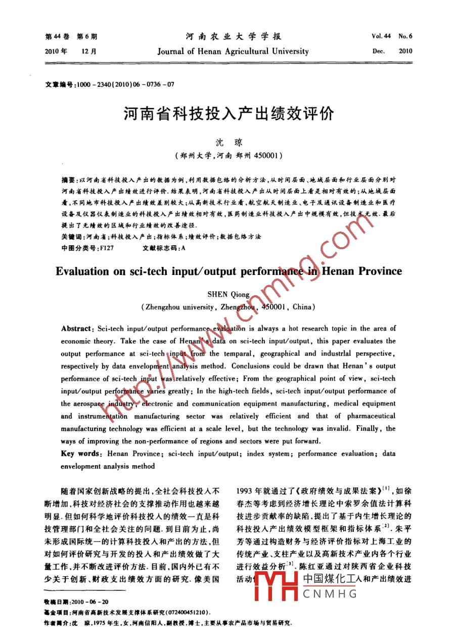 河南省科技投入产出绩效评价