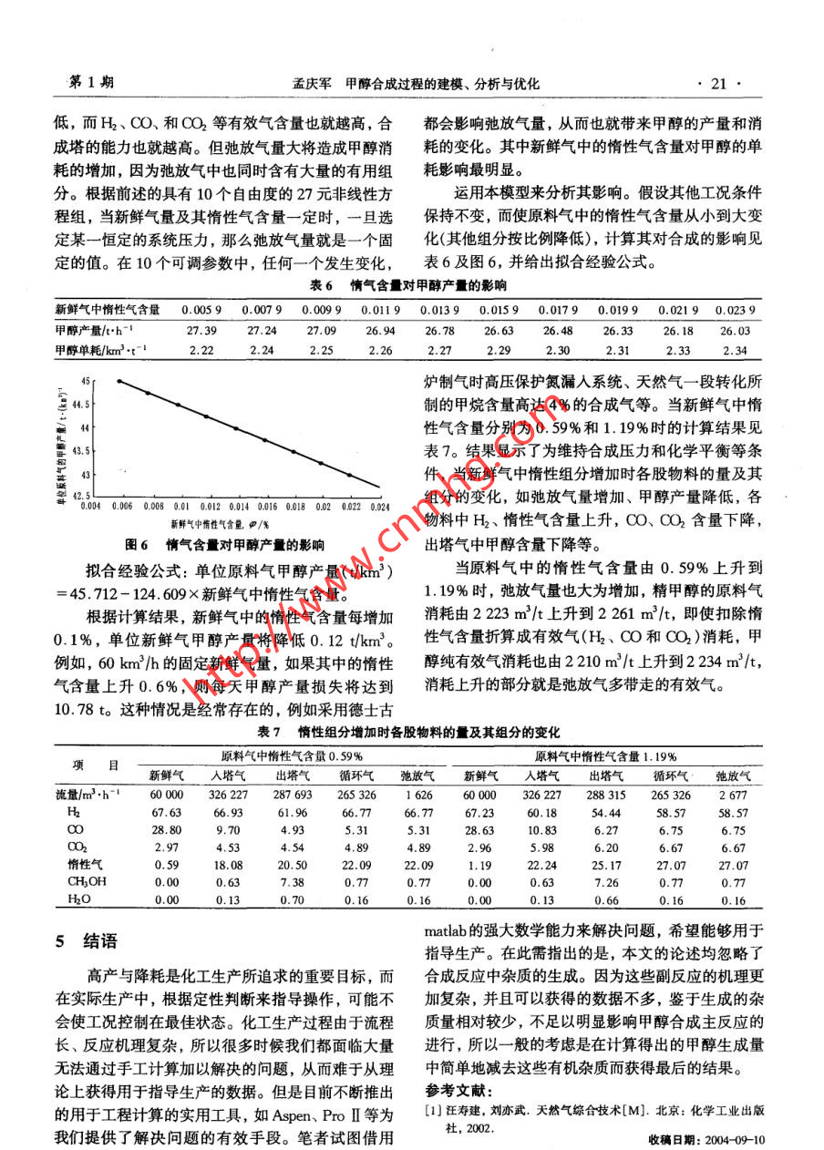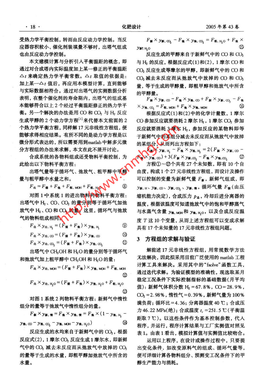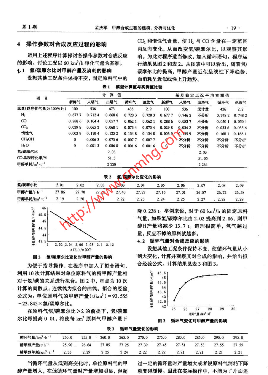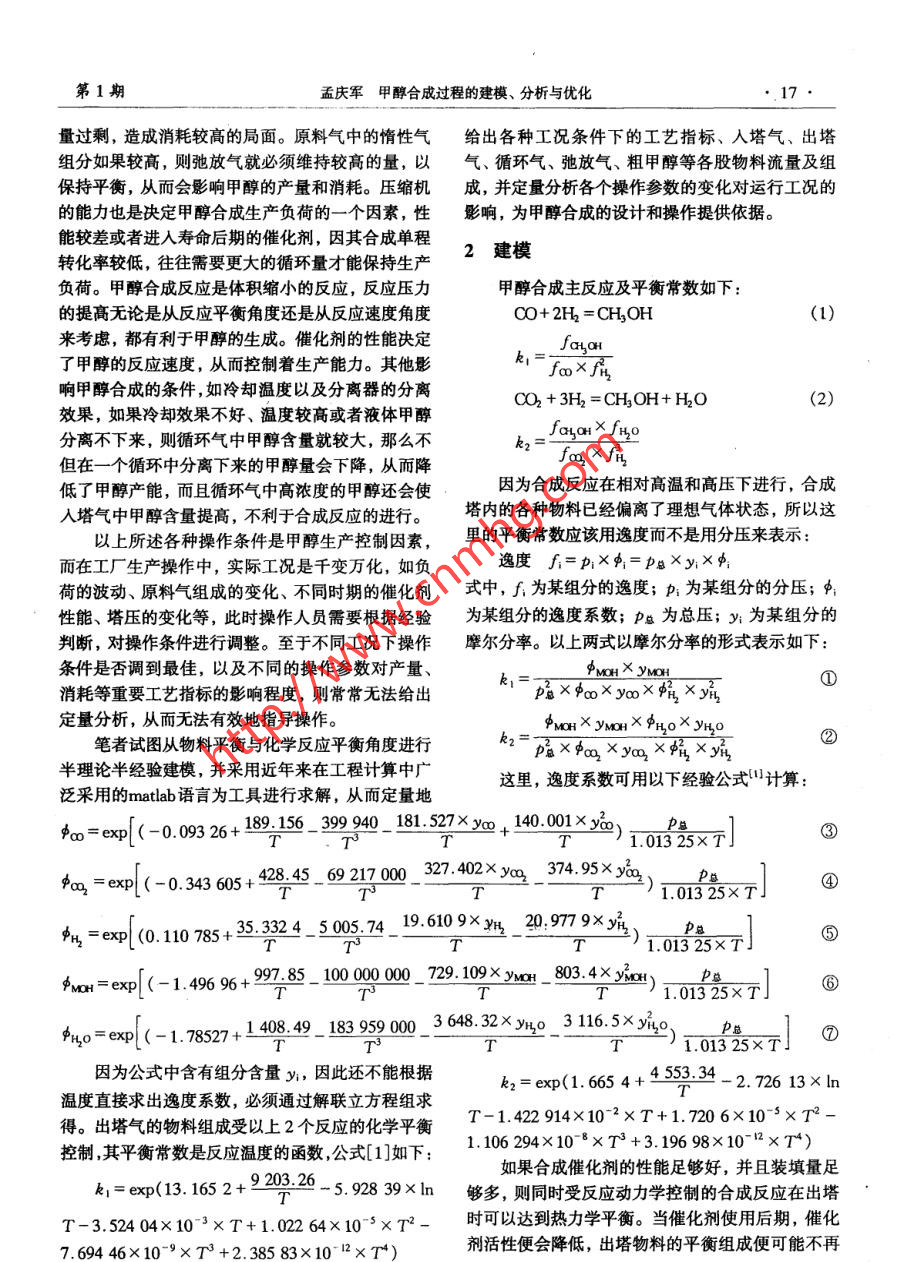 甲醇合成过程的建模、分析与优化