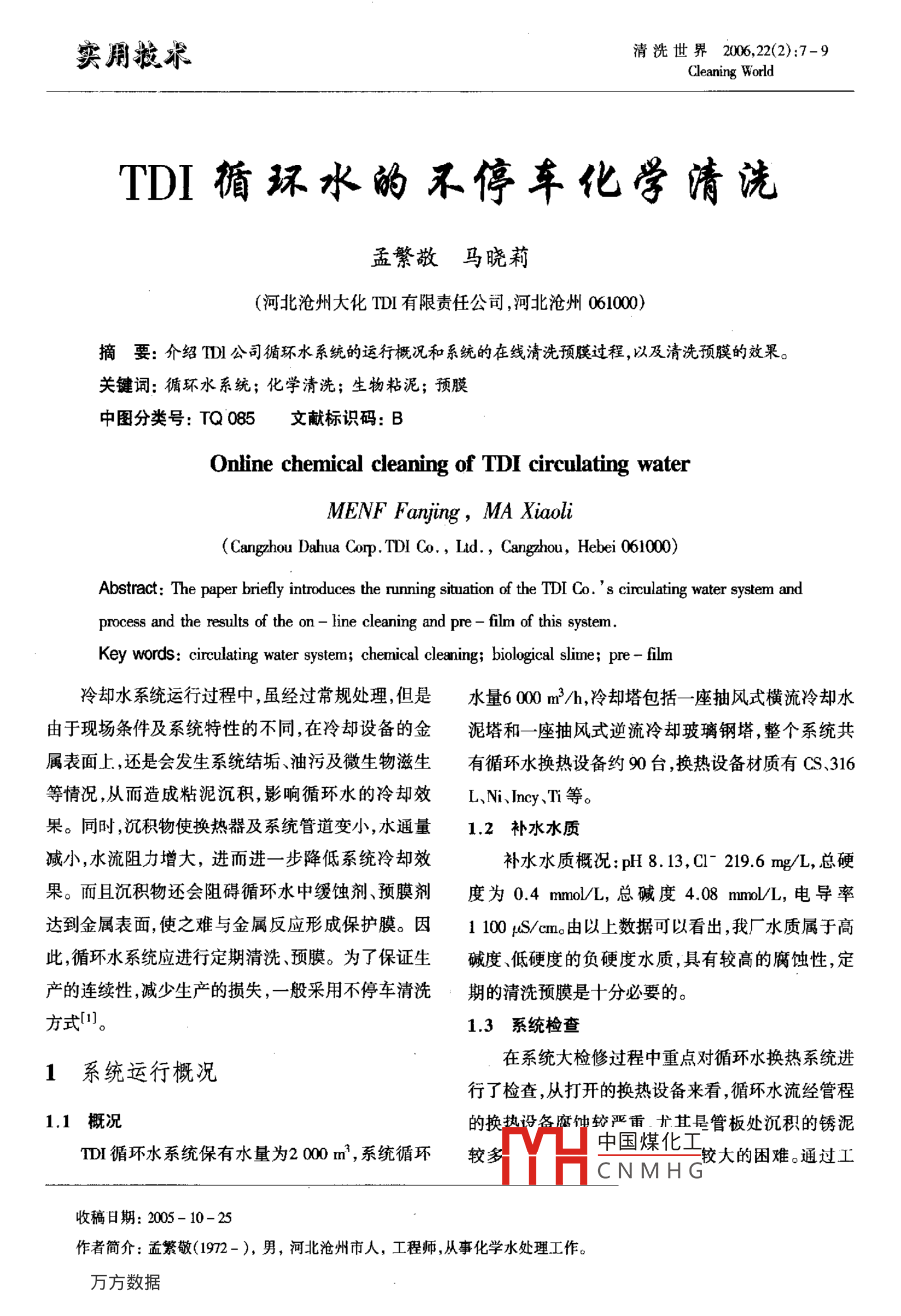 TDI循环水的不停车化学清洗