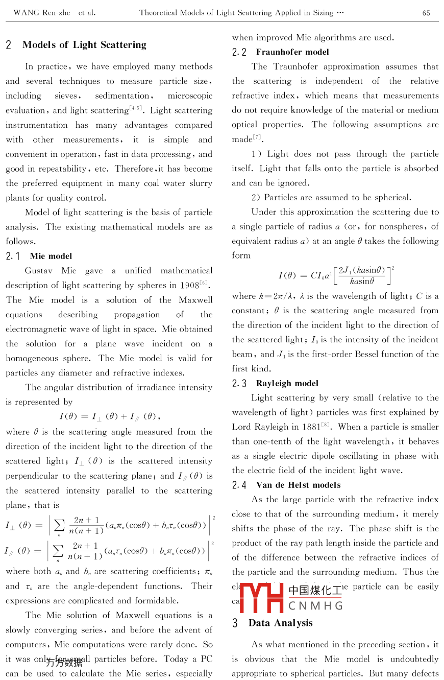 Theoretical Models of Light Scattering Applied in Sizing Particles in Coal Water Slurry