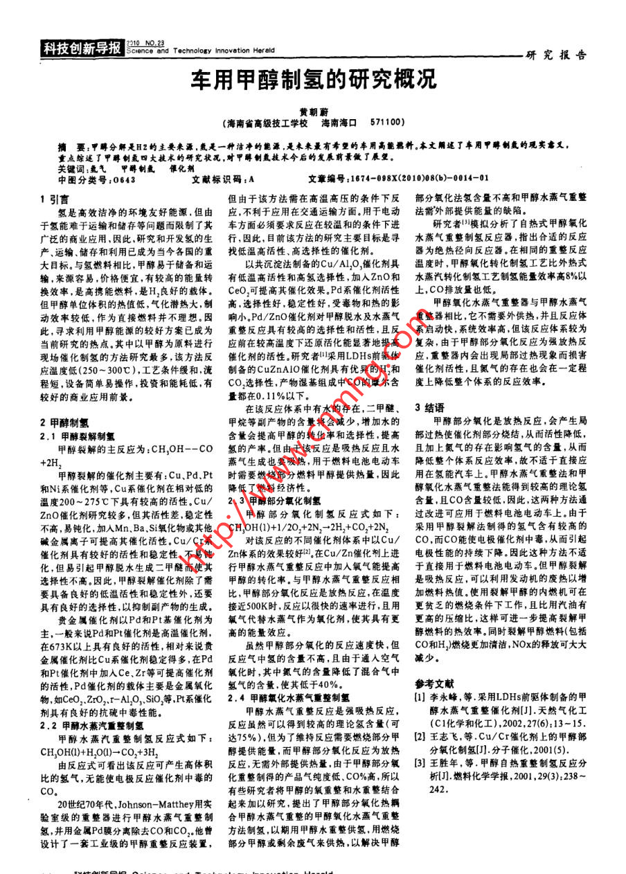 车用甲醇制氢的研究概况