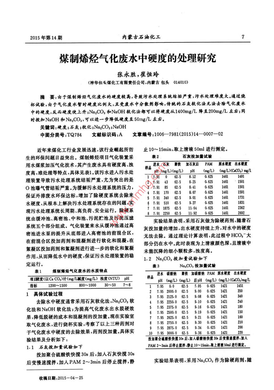 煤制烯烃气化废水中硬度的处理研究