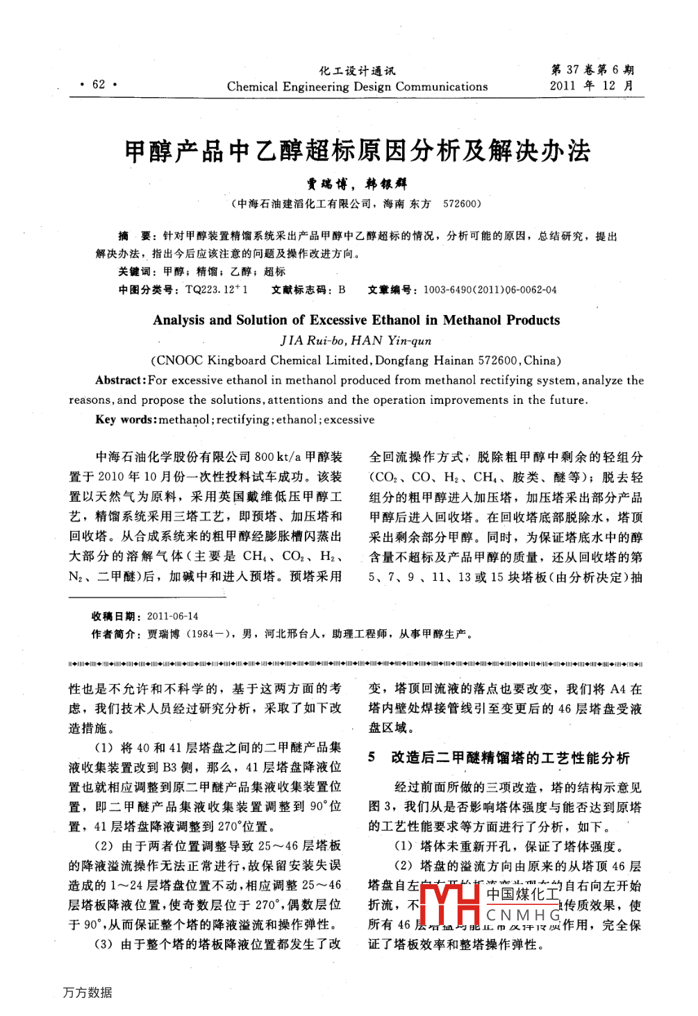 甲醇产品中乙醇超标原因分析及解决办法