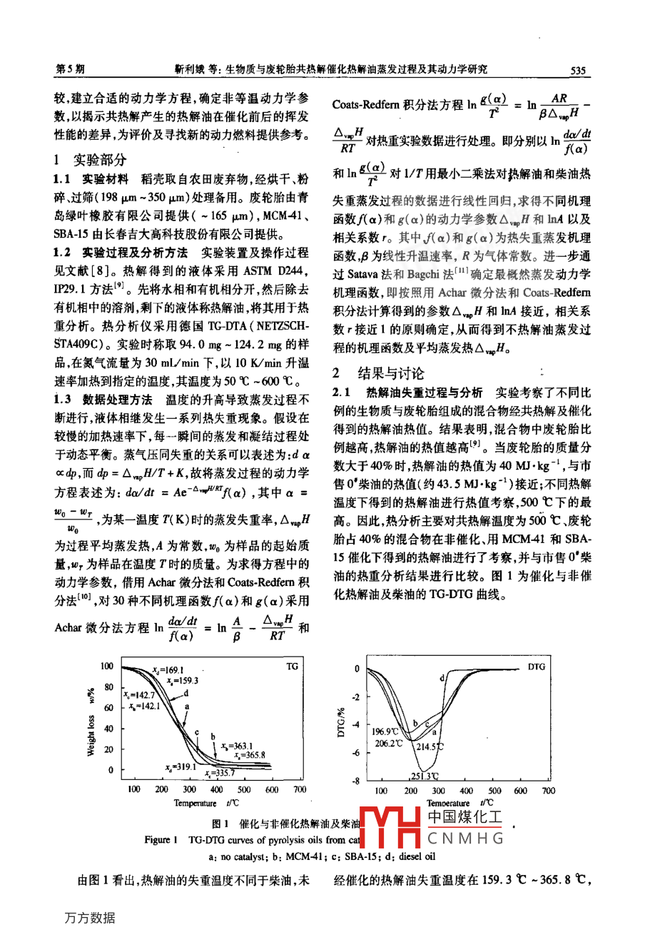 生物质与废轮胎共热解催化热解油蒸发过程及其动力学研究