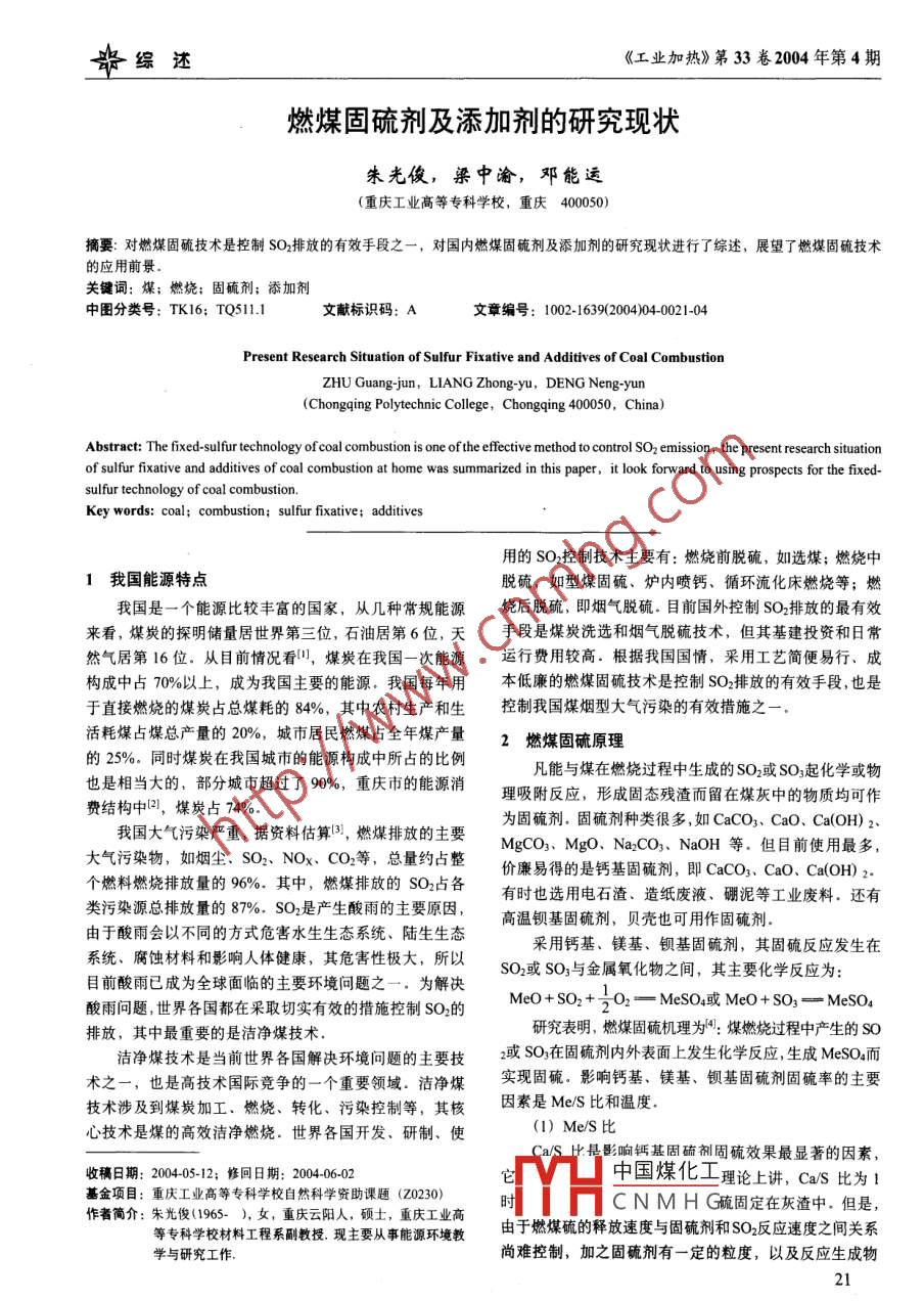 燃煤固硫剂及添加剂的研究现状