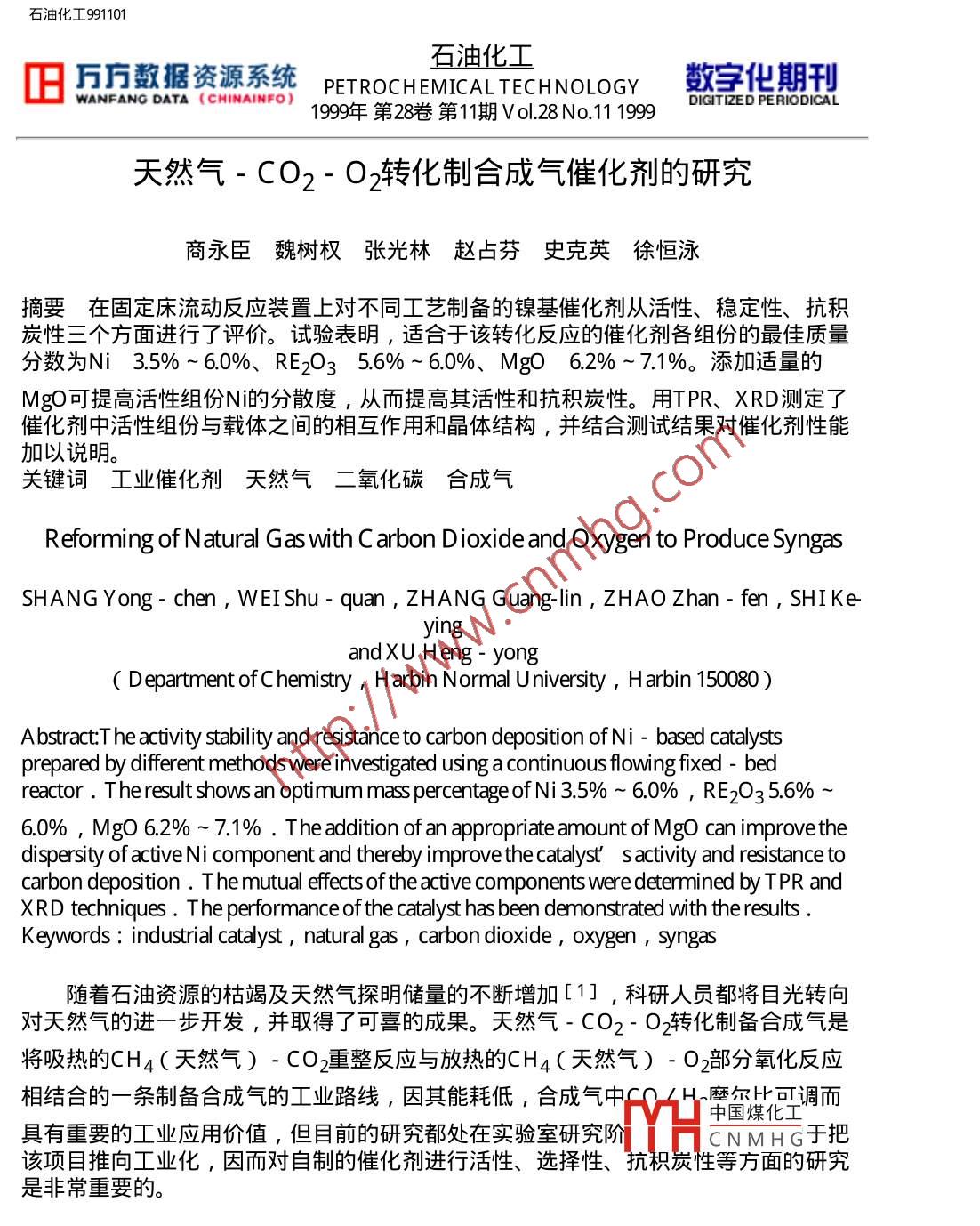 天然气-CO2-O2转化制合成气催化剂的研究