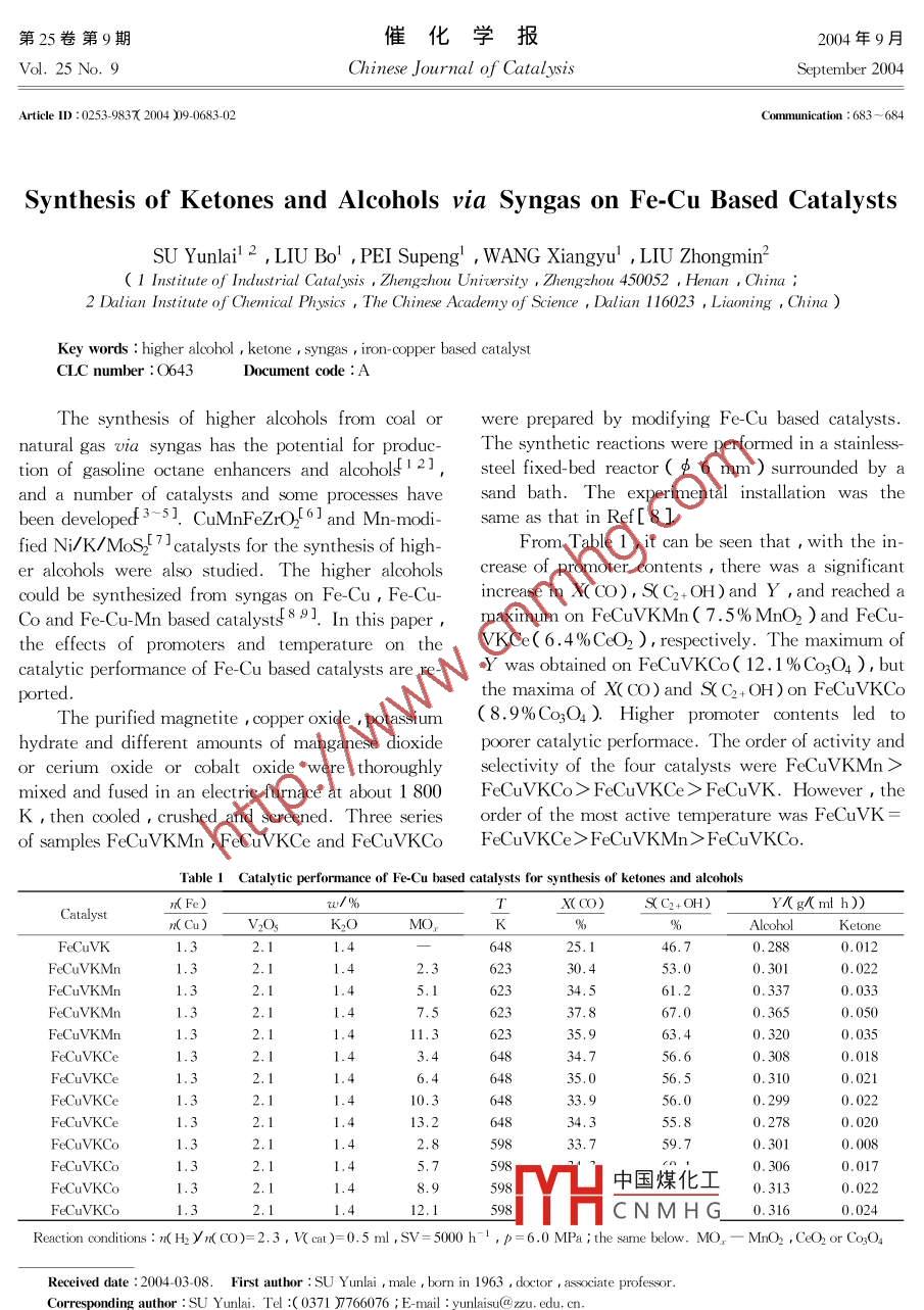 改性Fe-Cu催化剂上由合成气合成酮和醇