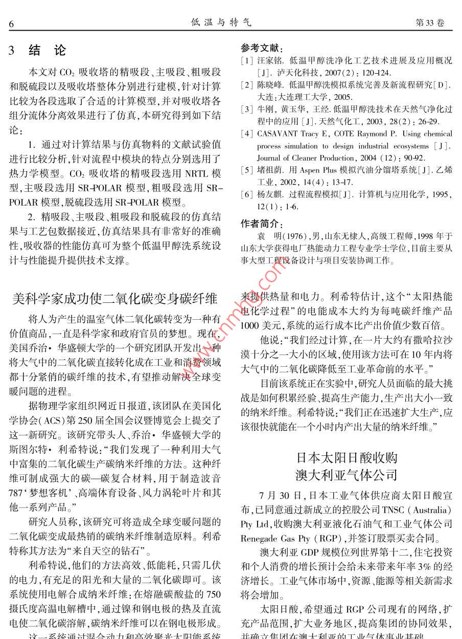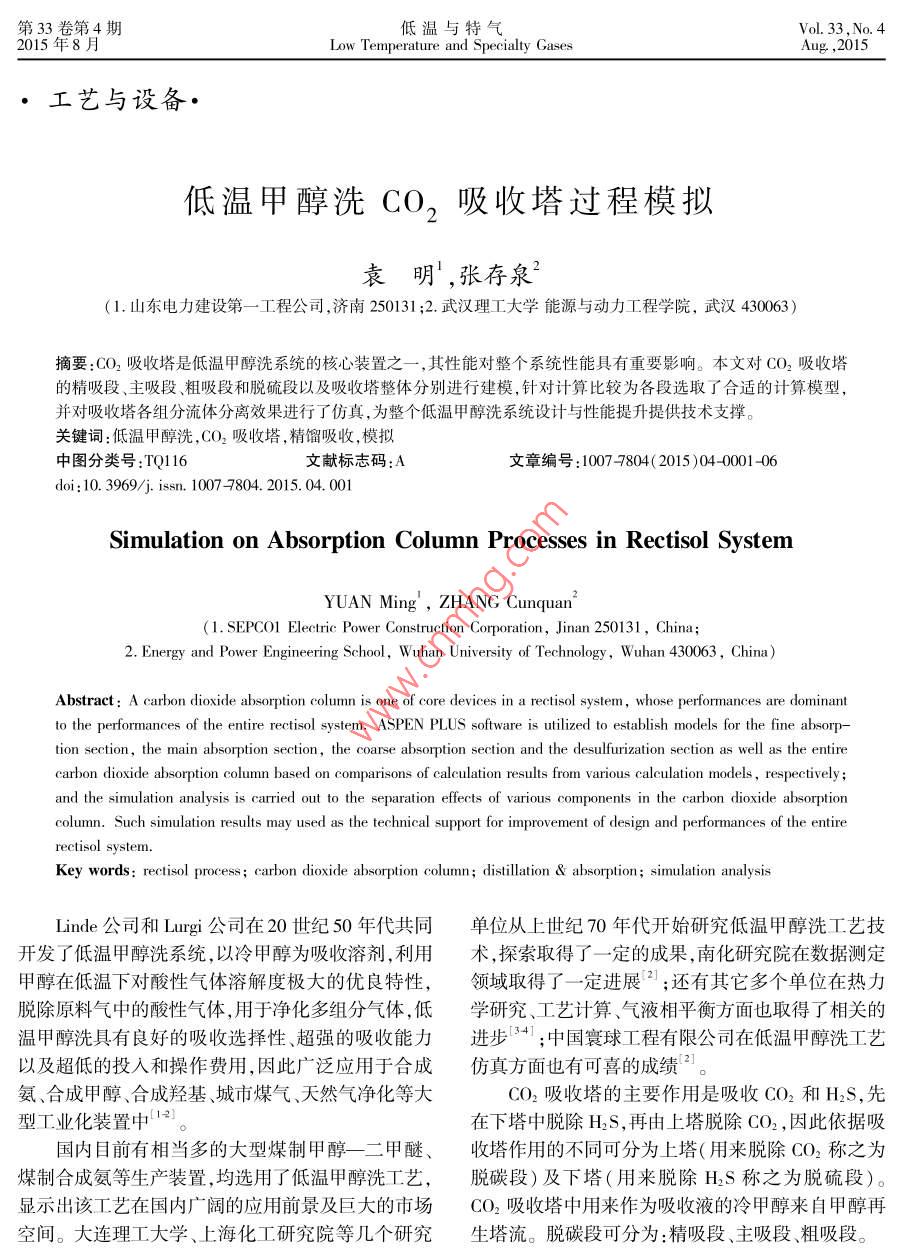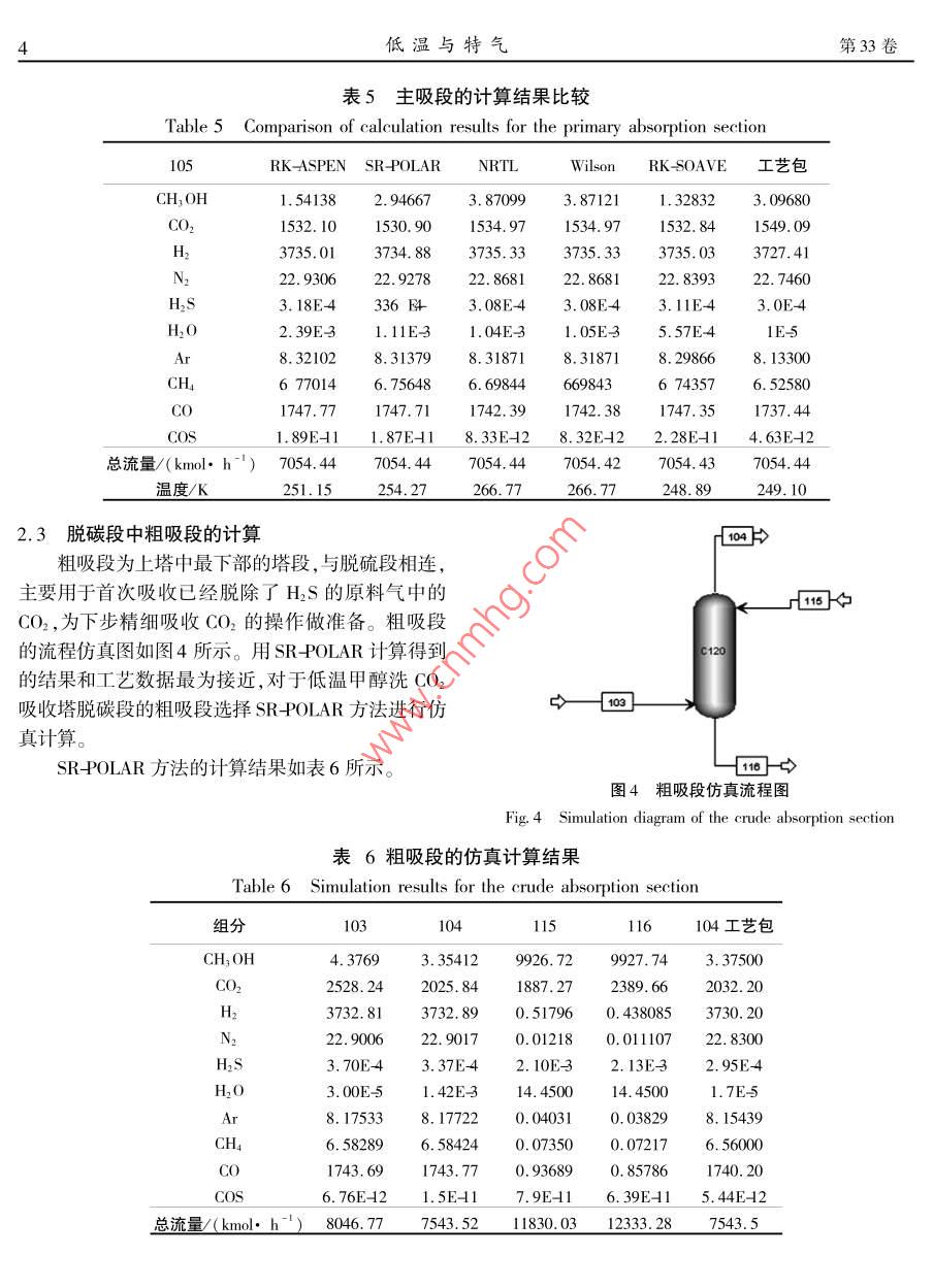 低温甲醇洗 CO2吸收塔过程模拟