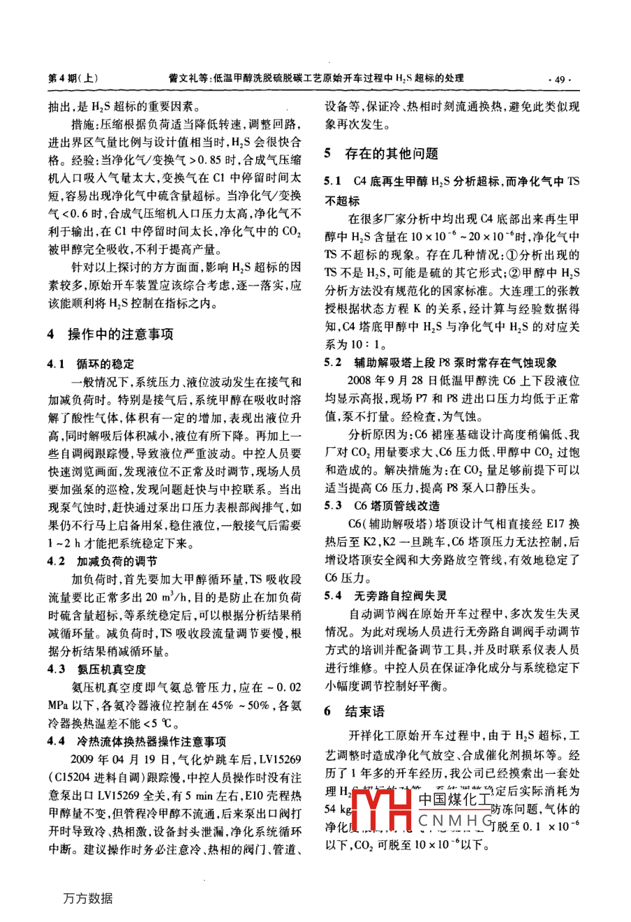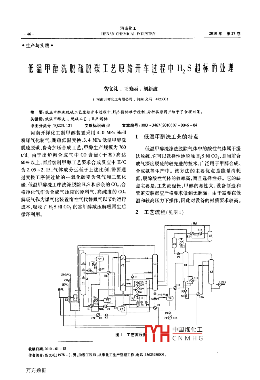 低温甲醇洗脱硫脱碳工艺原始开车过程中H2S超标的处理