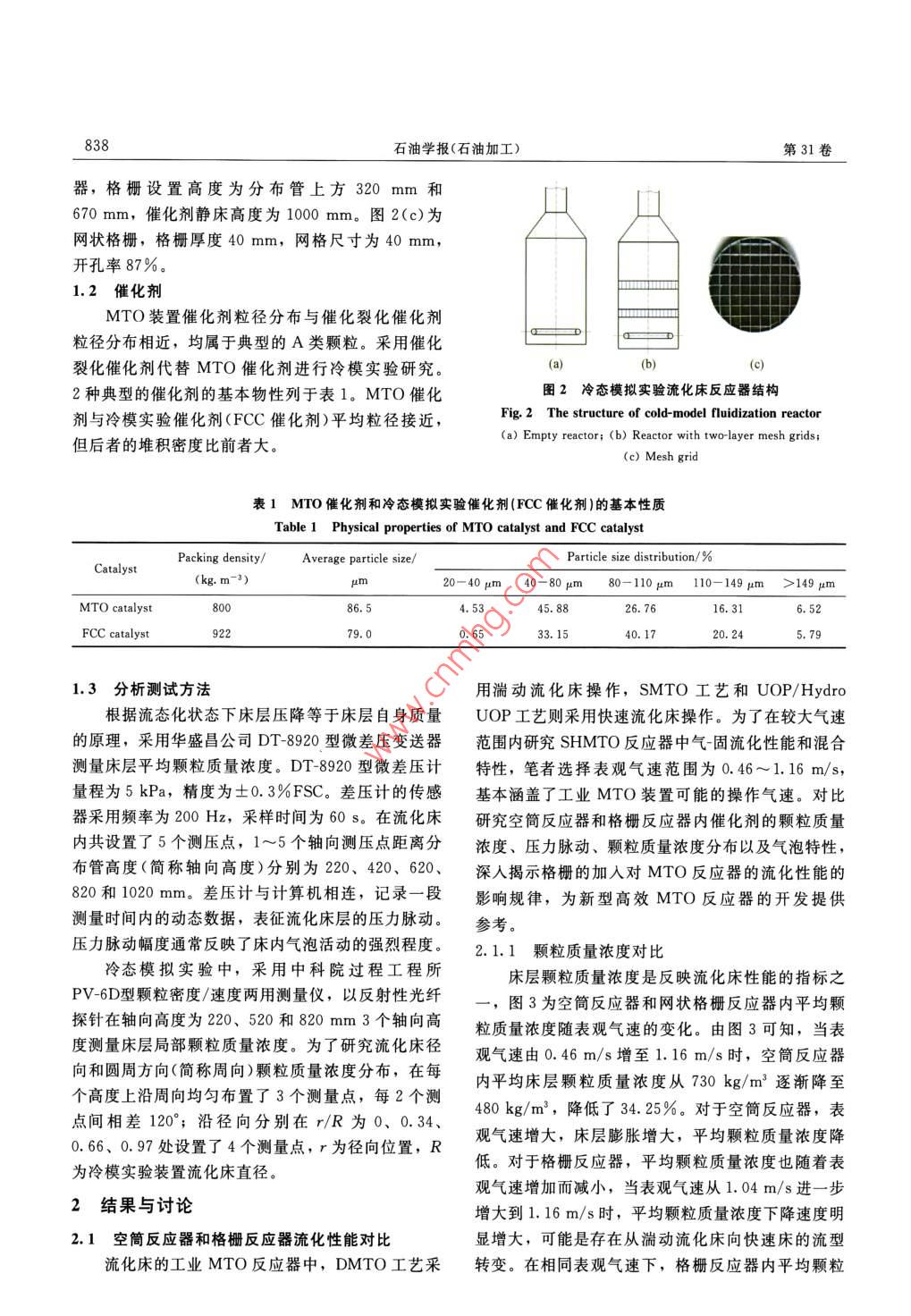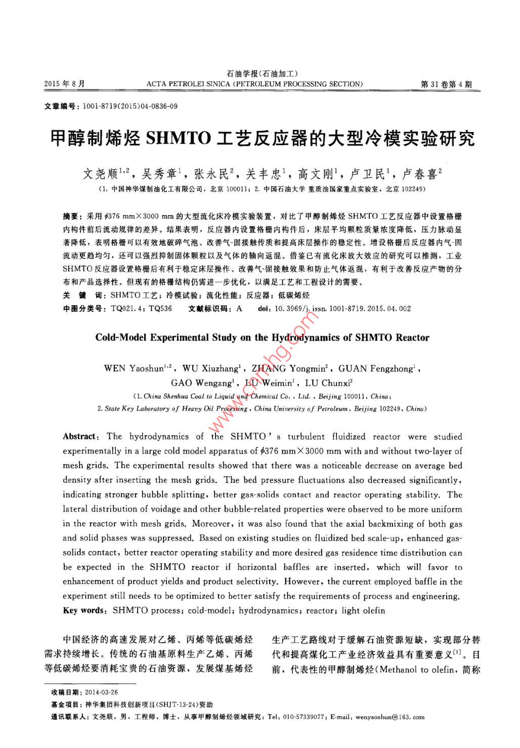 甲醇制烯烃SHMTO工艺反应器的大型冷模实验研究