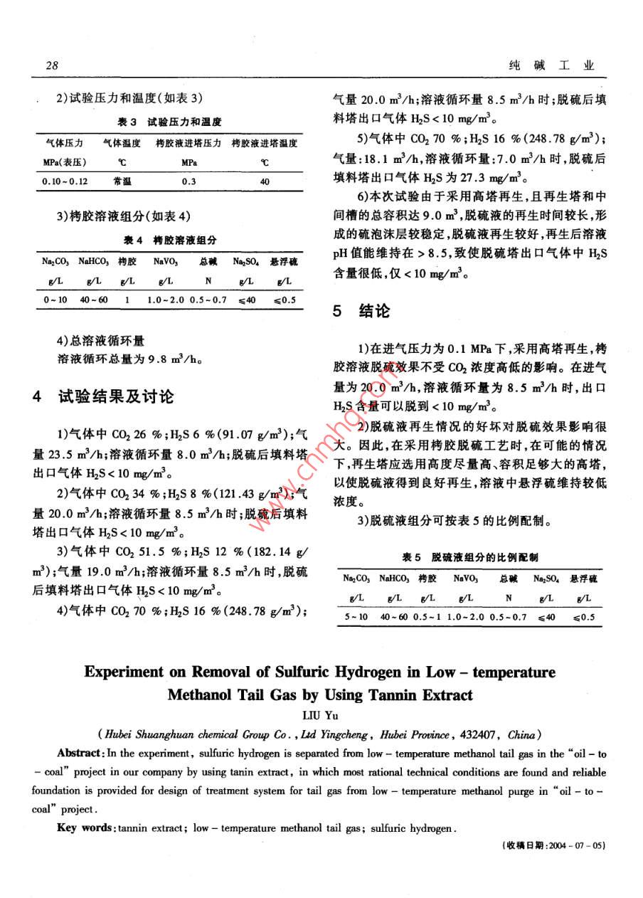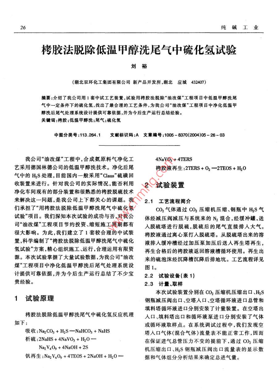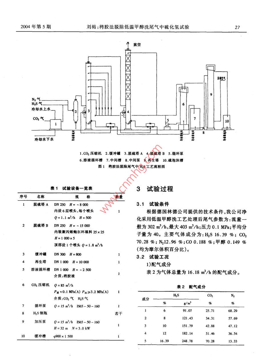 栲胶法脱除低温甲醇洗尾气中硫化氢试验