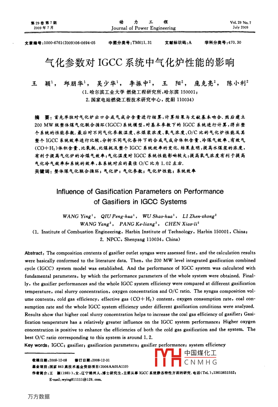 气化参数对IGCC系统中气化炉性能的影响
