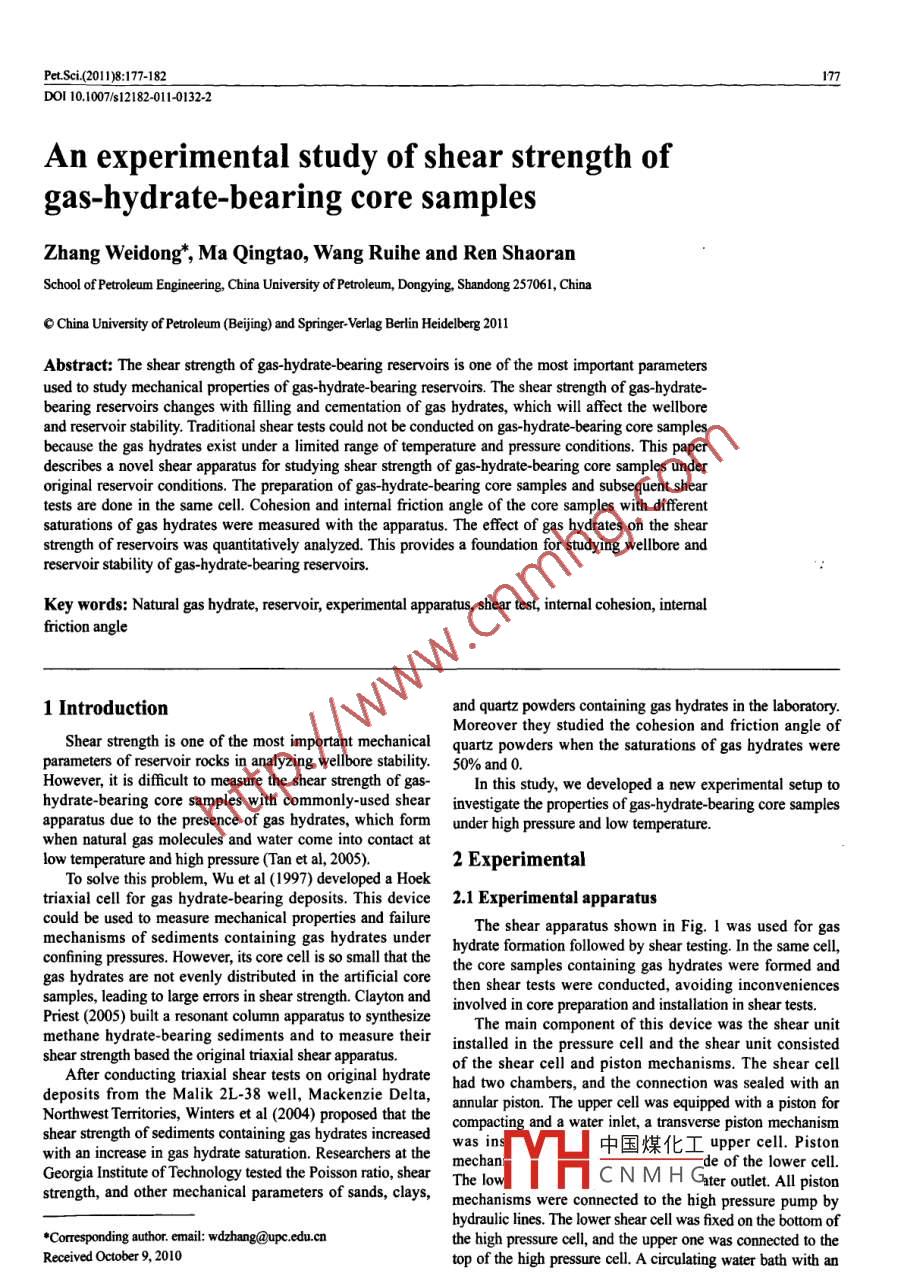 An experimental study of shear strength of gas-hydrate-bearing core samples