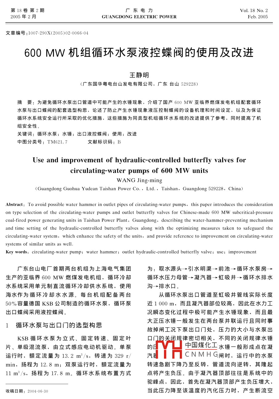 600 MW机组循环水泵液控蝶阀的使用及改进
