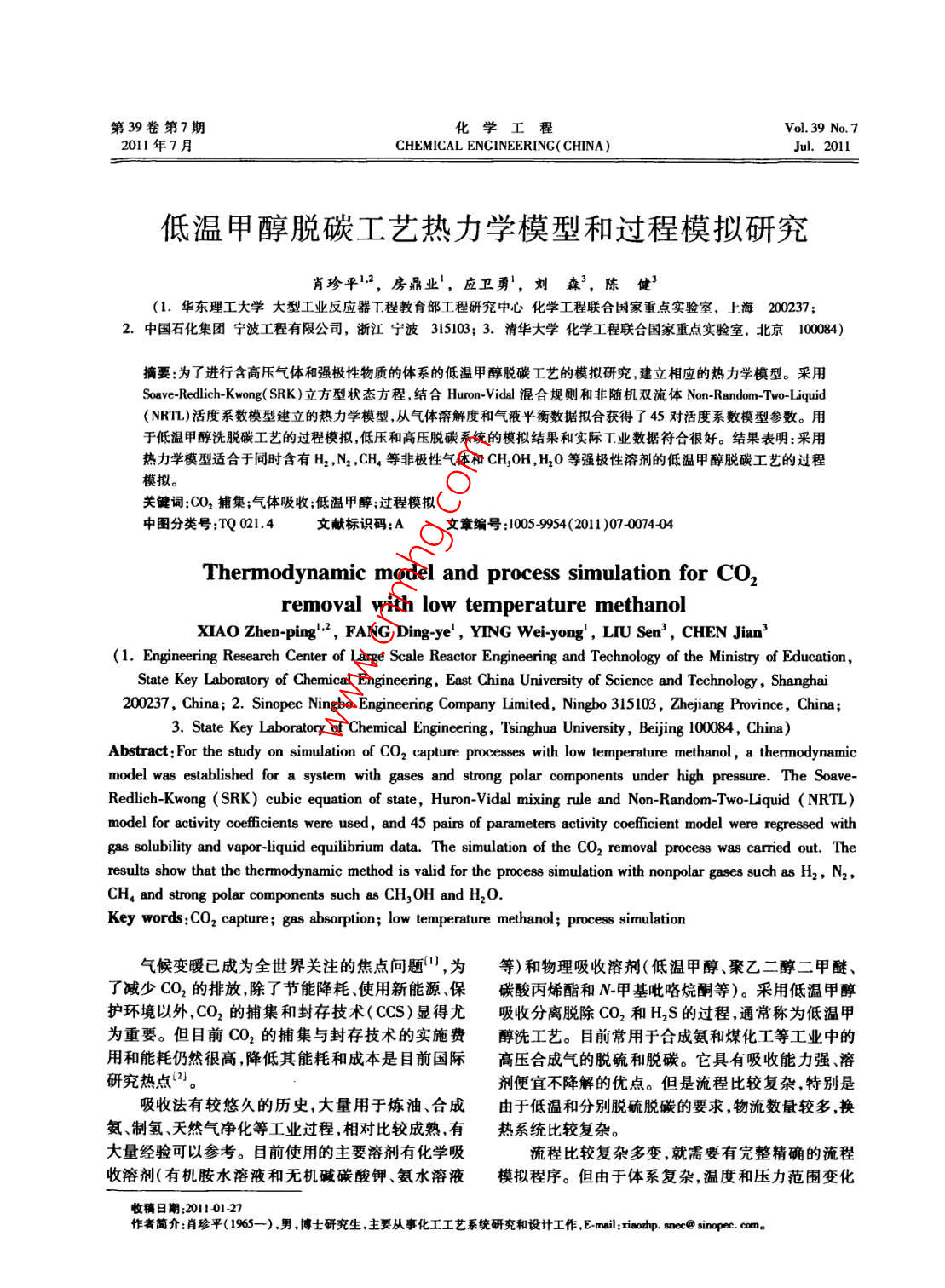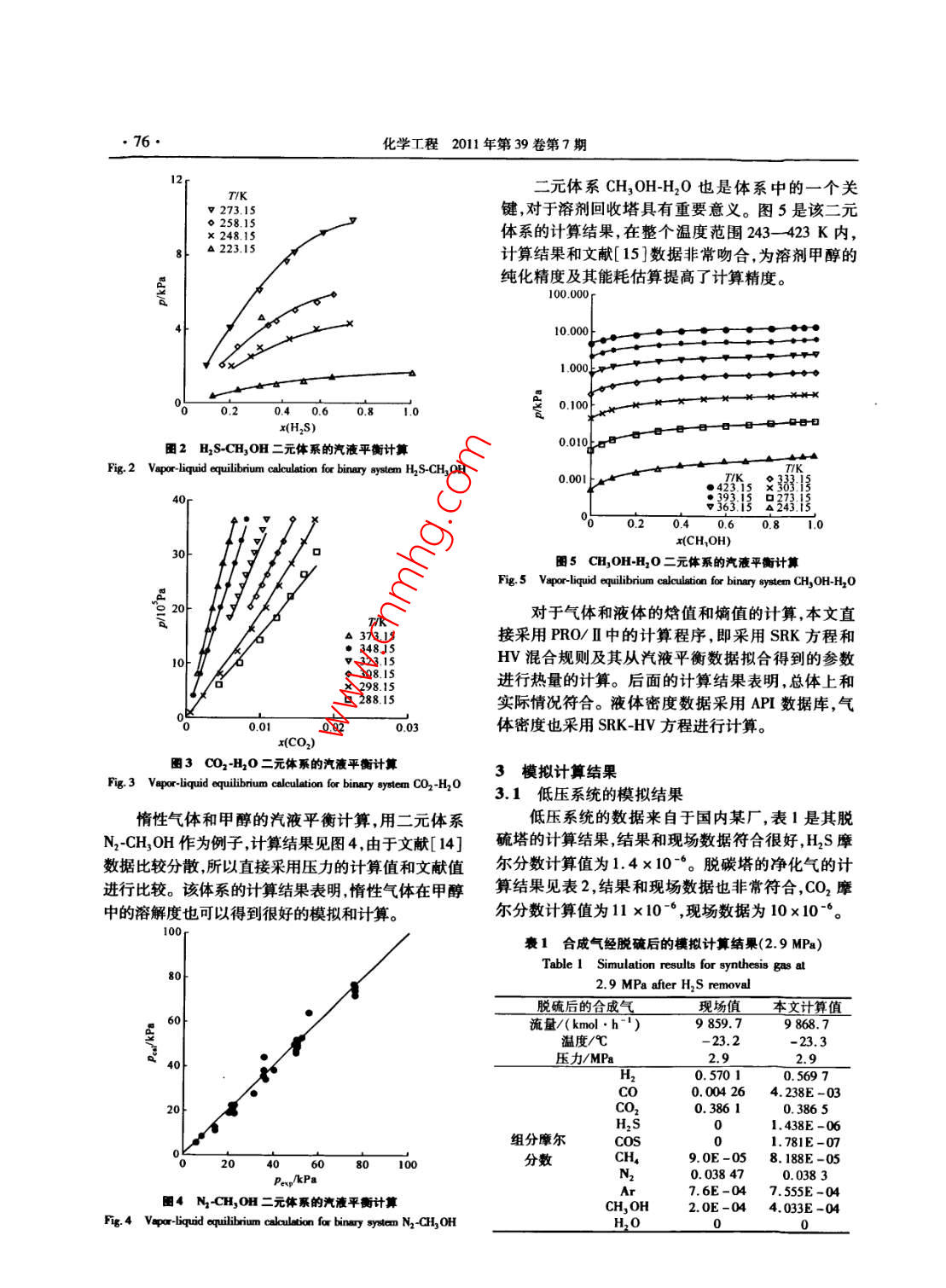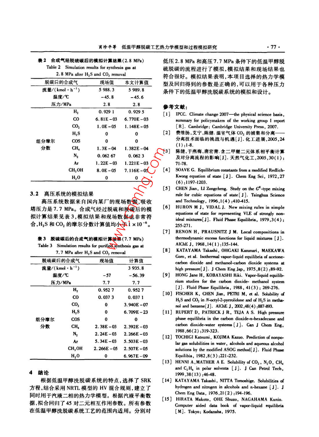 低温甲醇脱碳工艺热力学模型和过程模拟研究