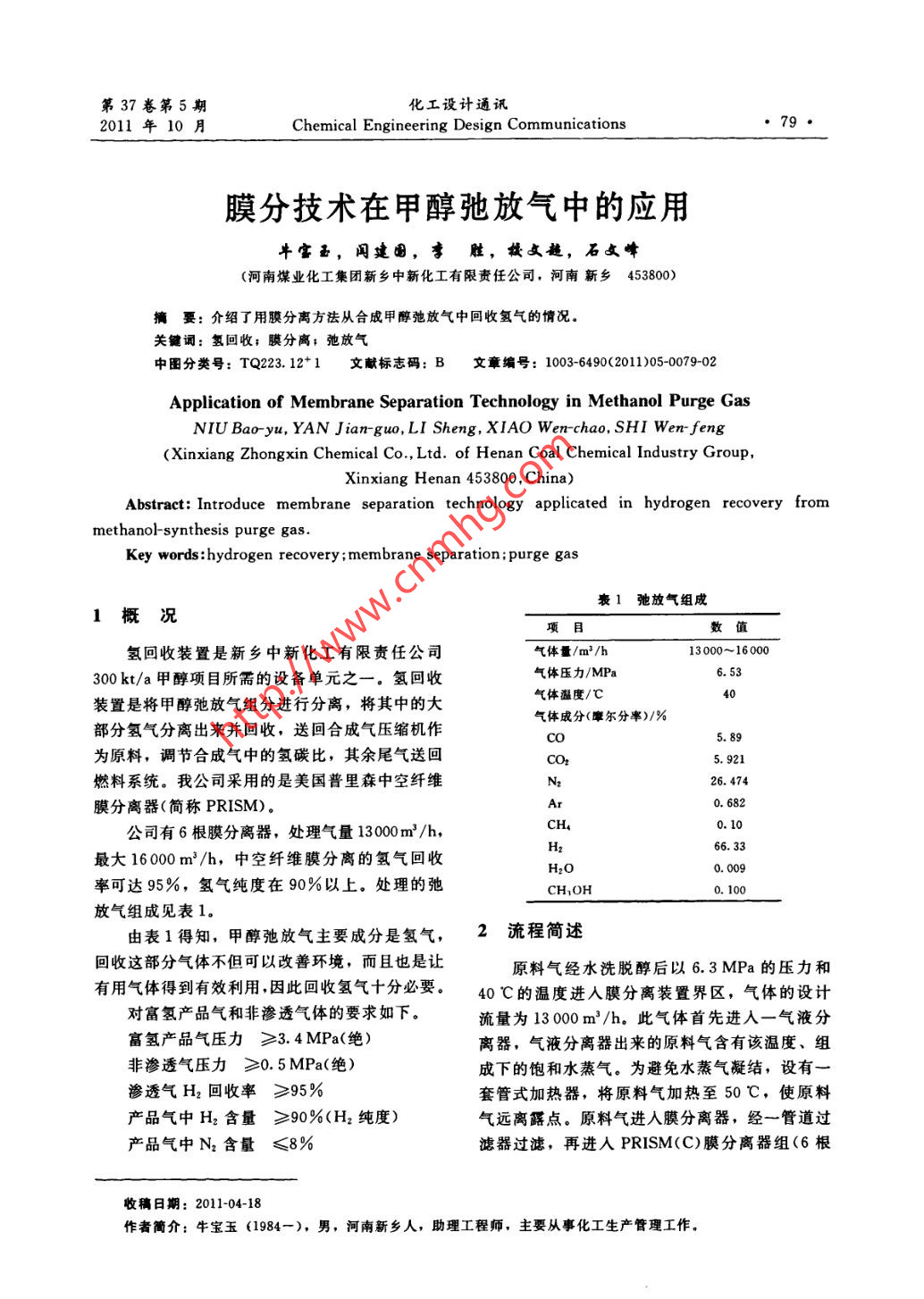 膜分技术在甲醇弛放气中的应用
