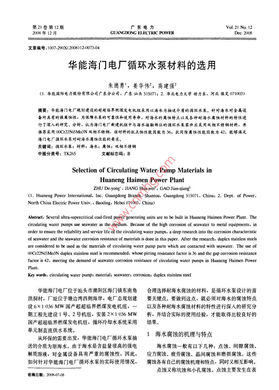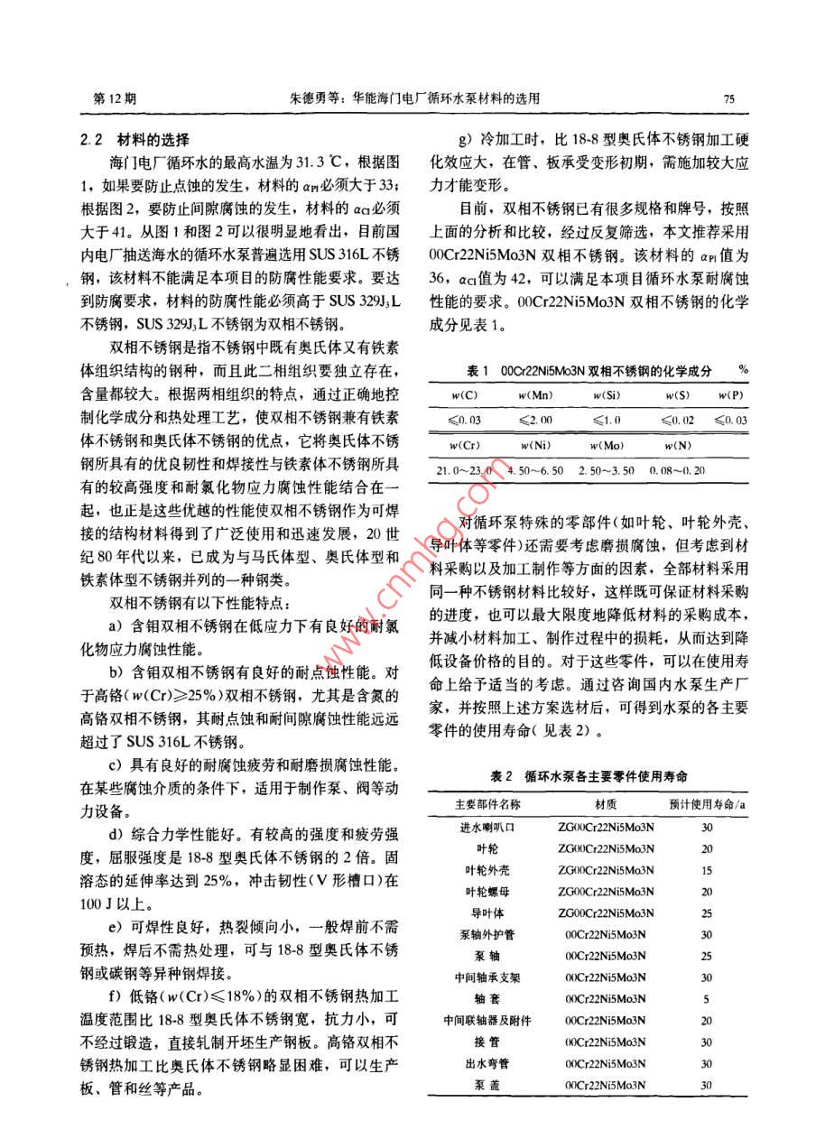 华能海门电厂循环水泵材料的选用