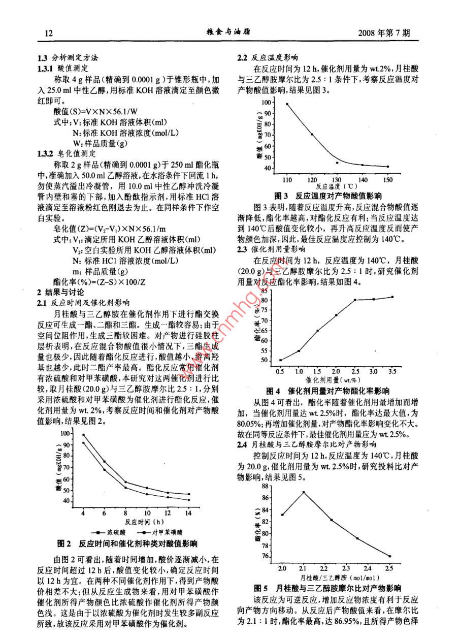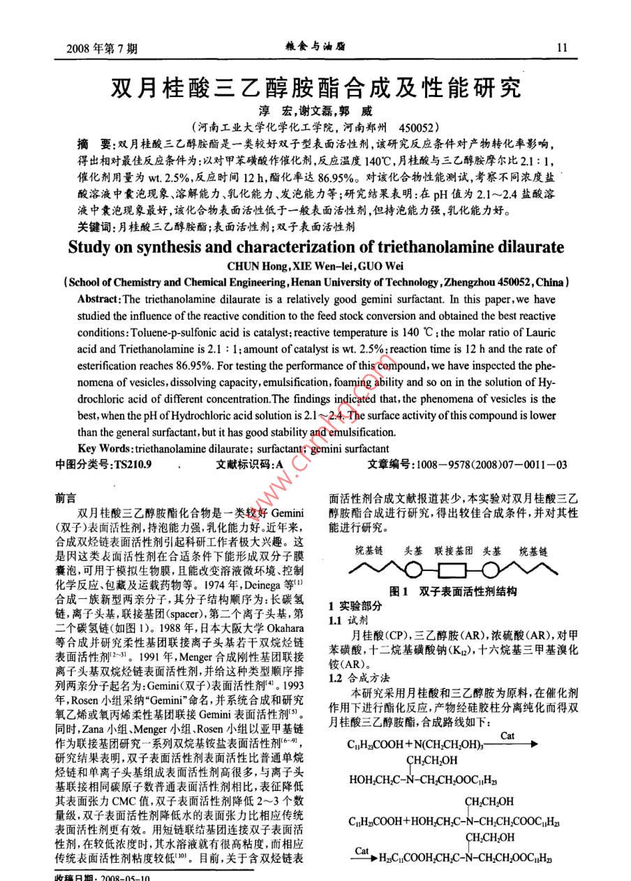 双月桂酸三乙醇胺酯合成及性能研究