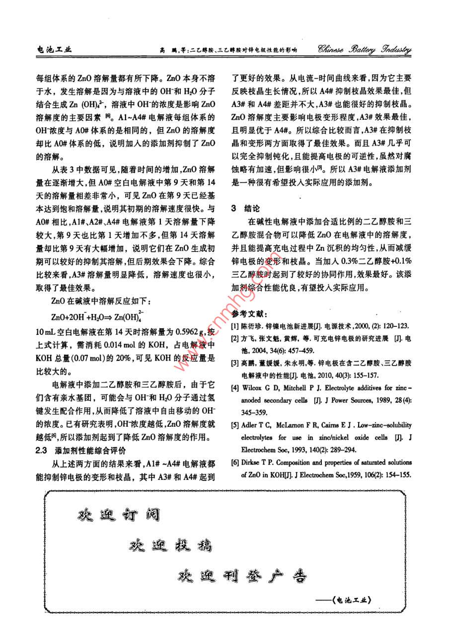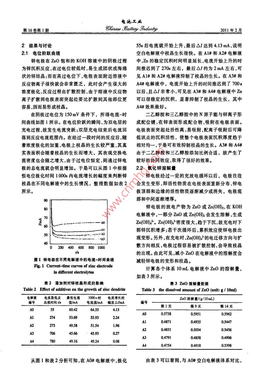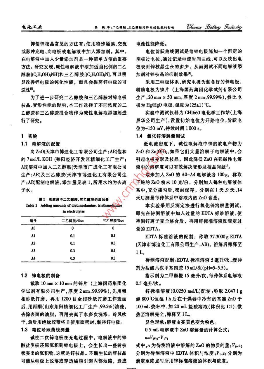 二乙醇胺、三乙醇胺对锌电极性能的影响
