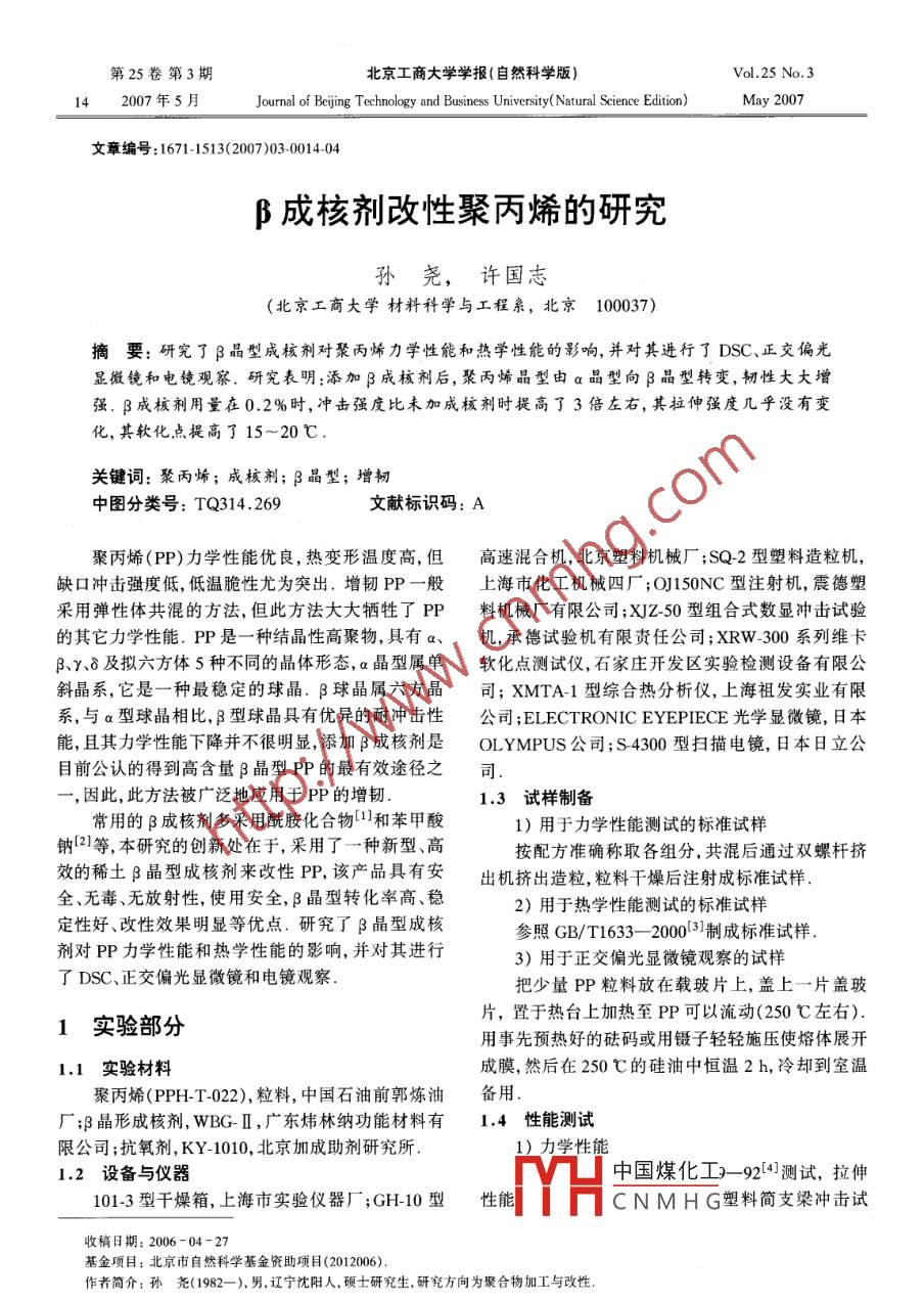 β成核剂改性聚丙烯的研究