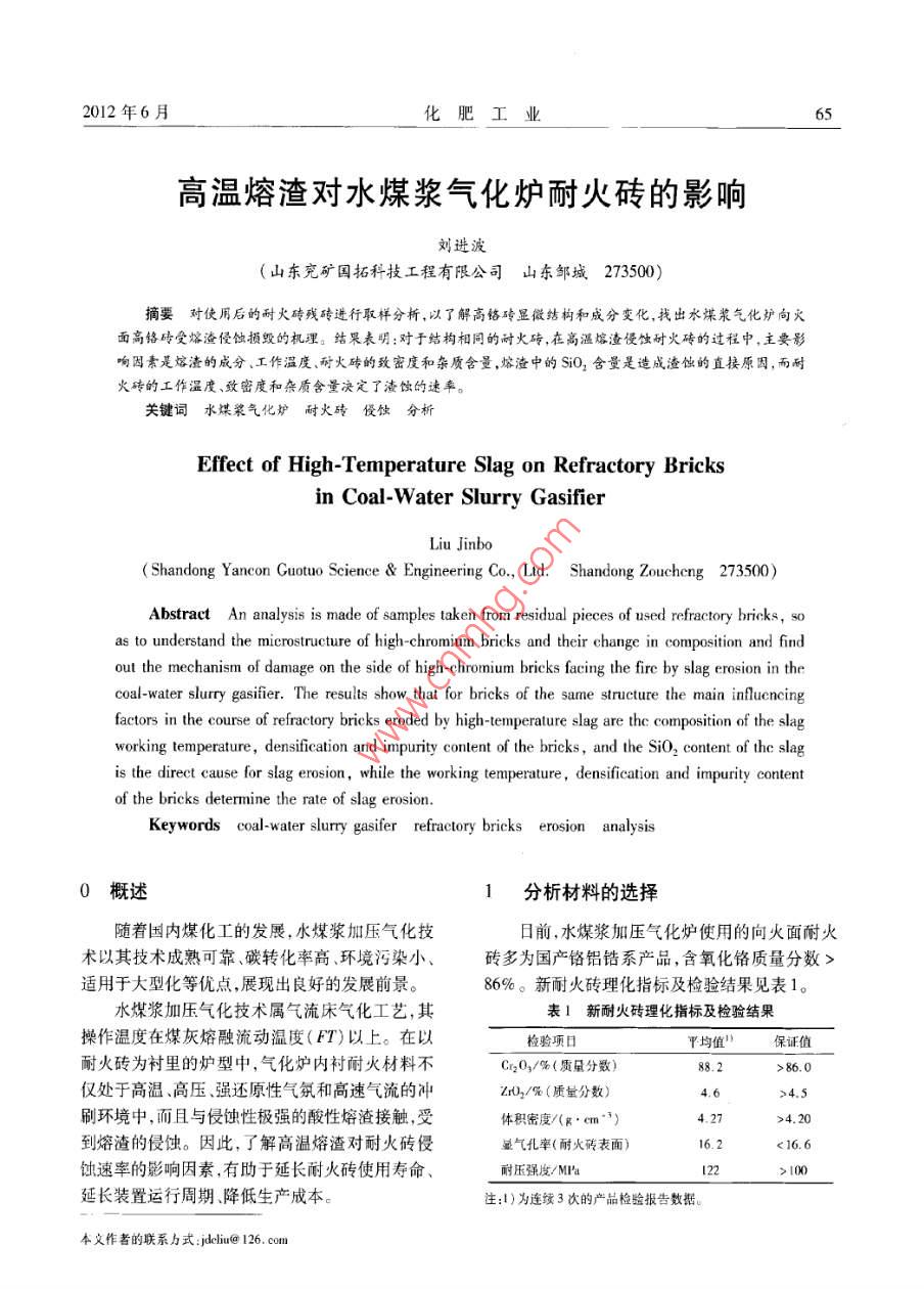 高温熔渣对水煤浆气化炉耐火砖的影响