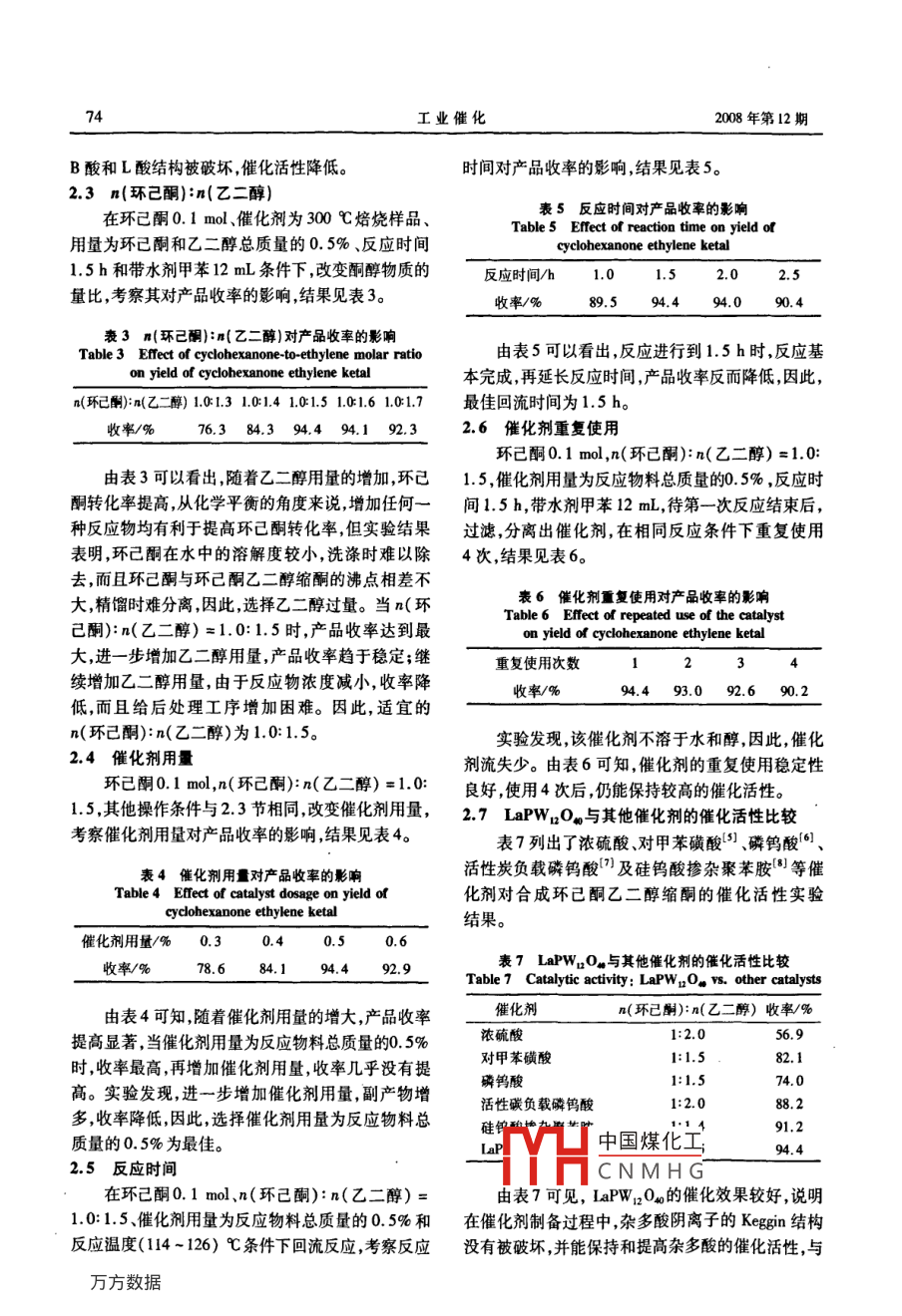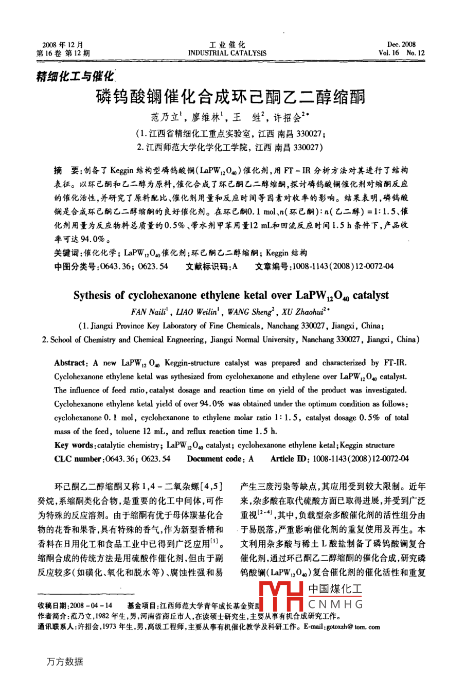 磷钨酸镧催化合成环己酮乙二醇缩酮