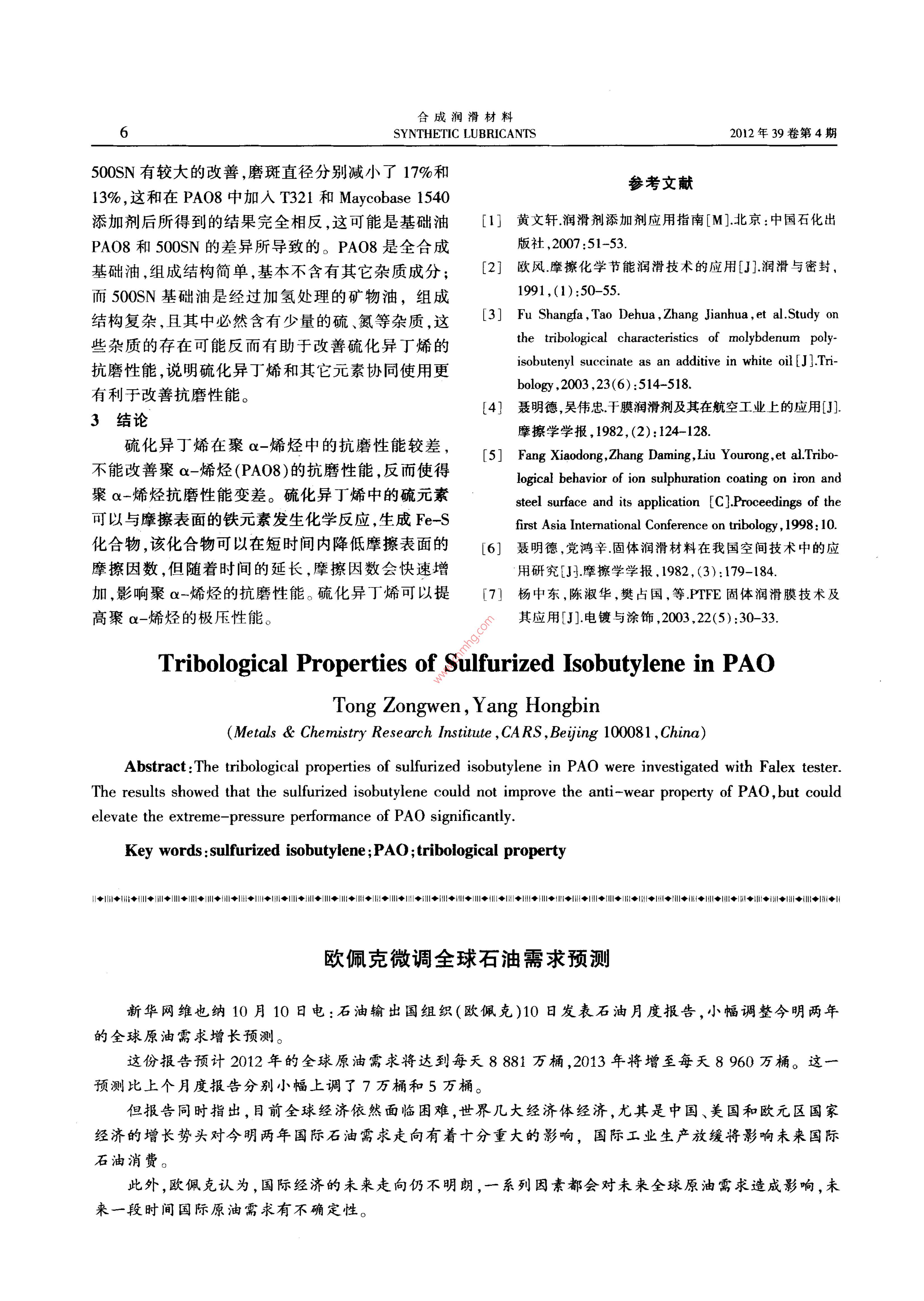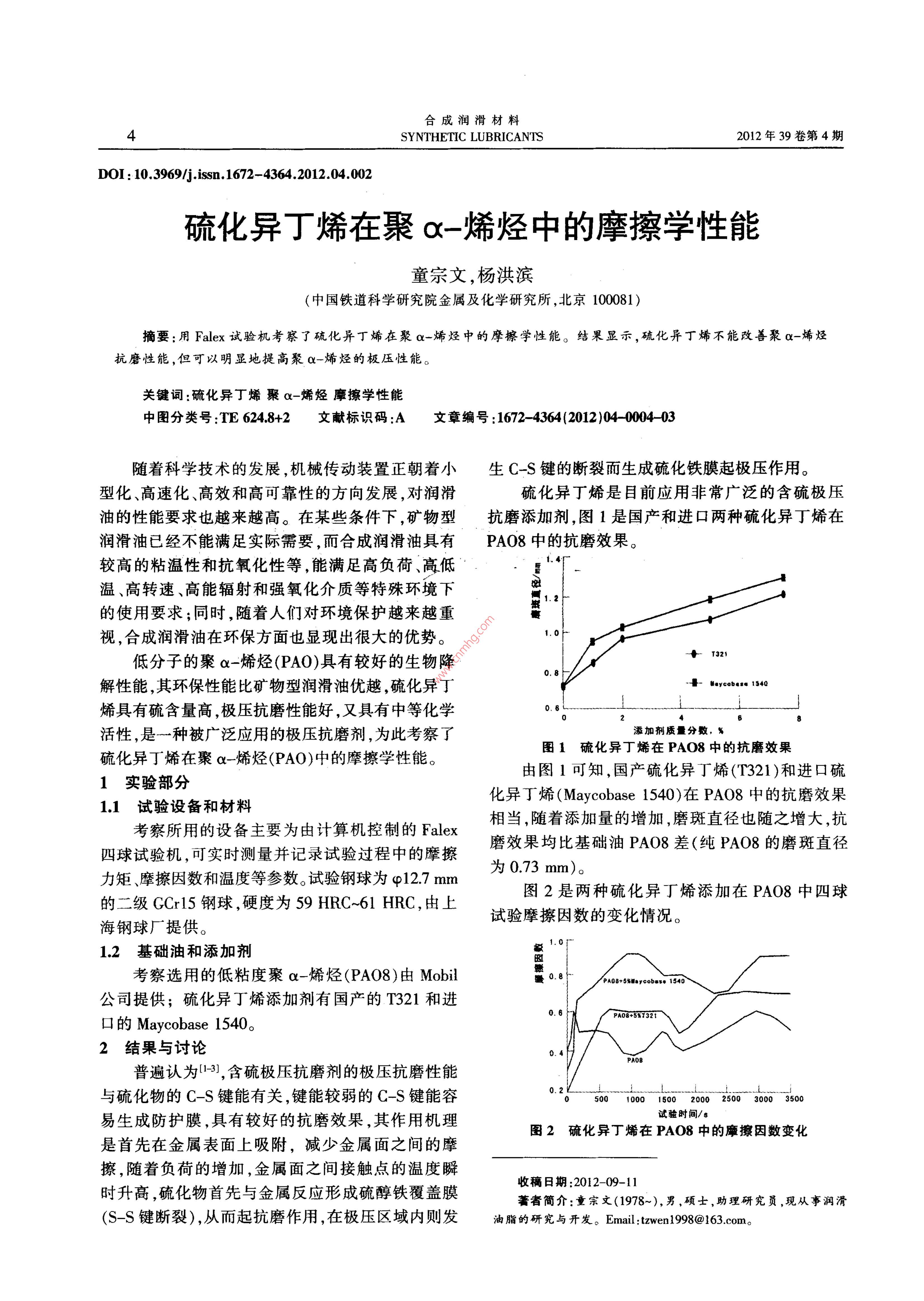 硫化异丁烯在聚α-烯烃中的摩擦学性能