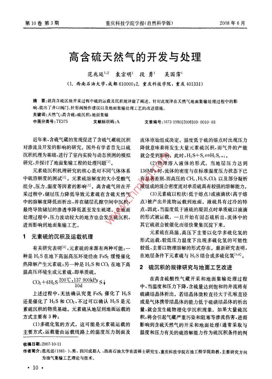 高含硫天然气的开发与处理