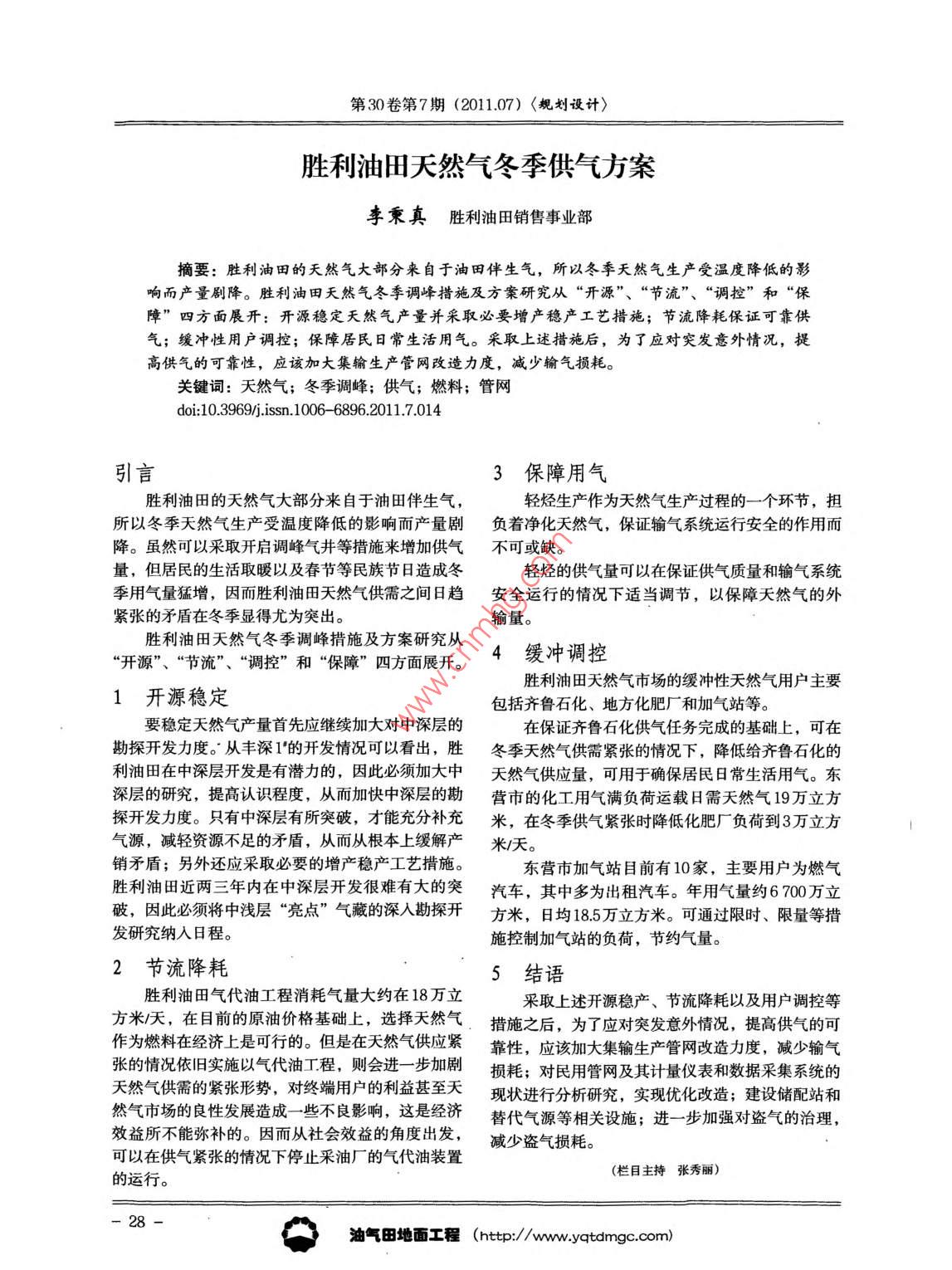 胜利油田天然气冬季供气方案