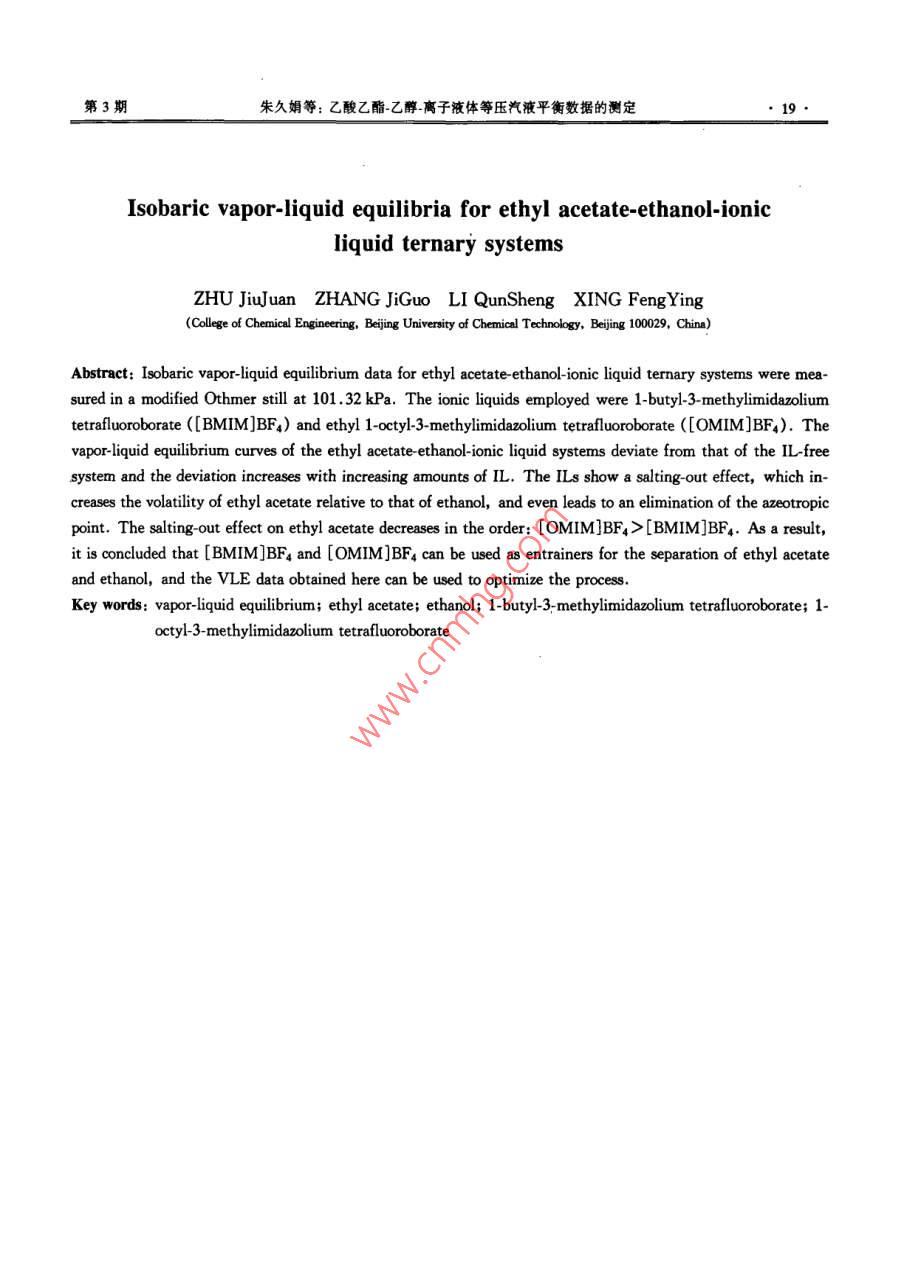乙酸乙酯-乙醇-离子液体等压汽液平衡数据的测定