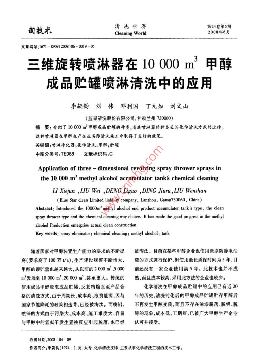 三维旋转喷淋器在10 000 m3甲醇成品贮罐喷淋清洗中的应用