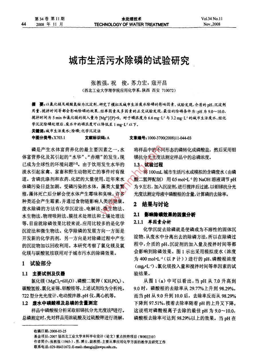 城市生活污水除磷的试验研究