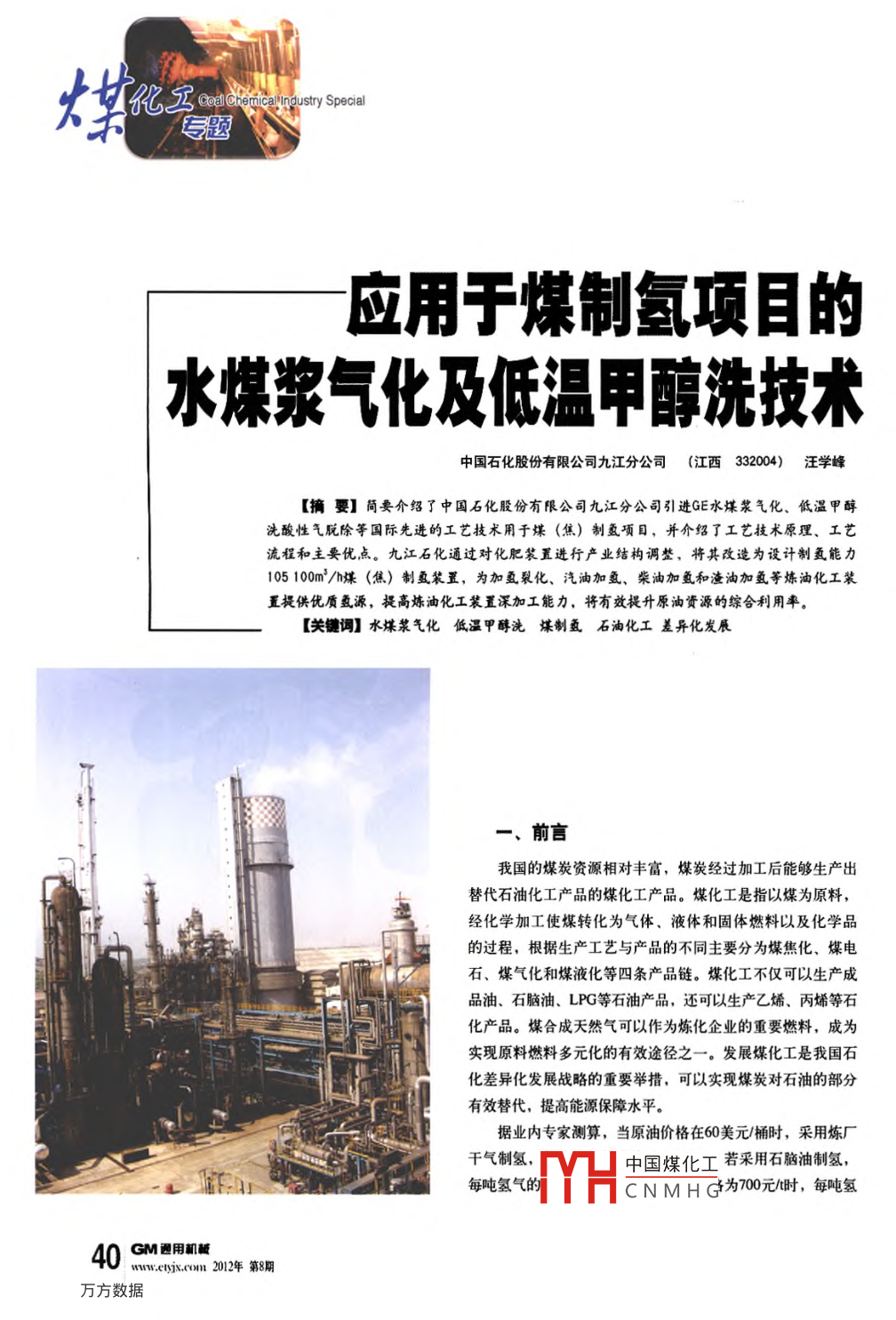 应用于煤制氢项目的水煤浆气化及低温甲醇洗技术