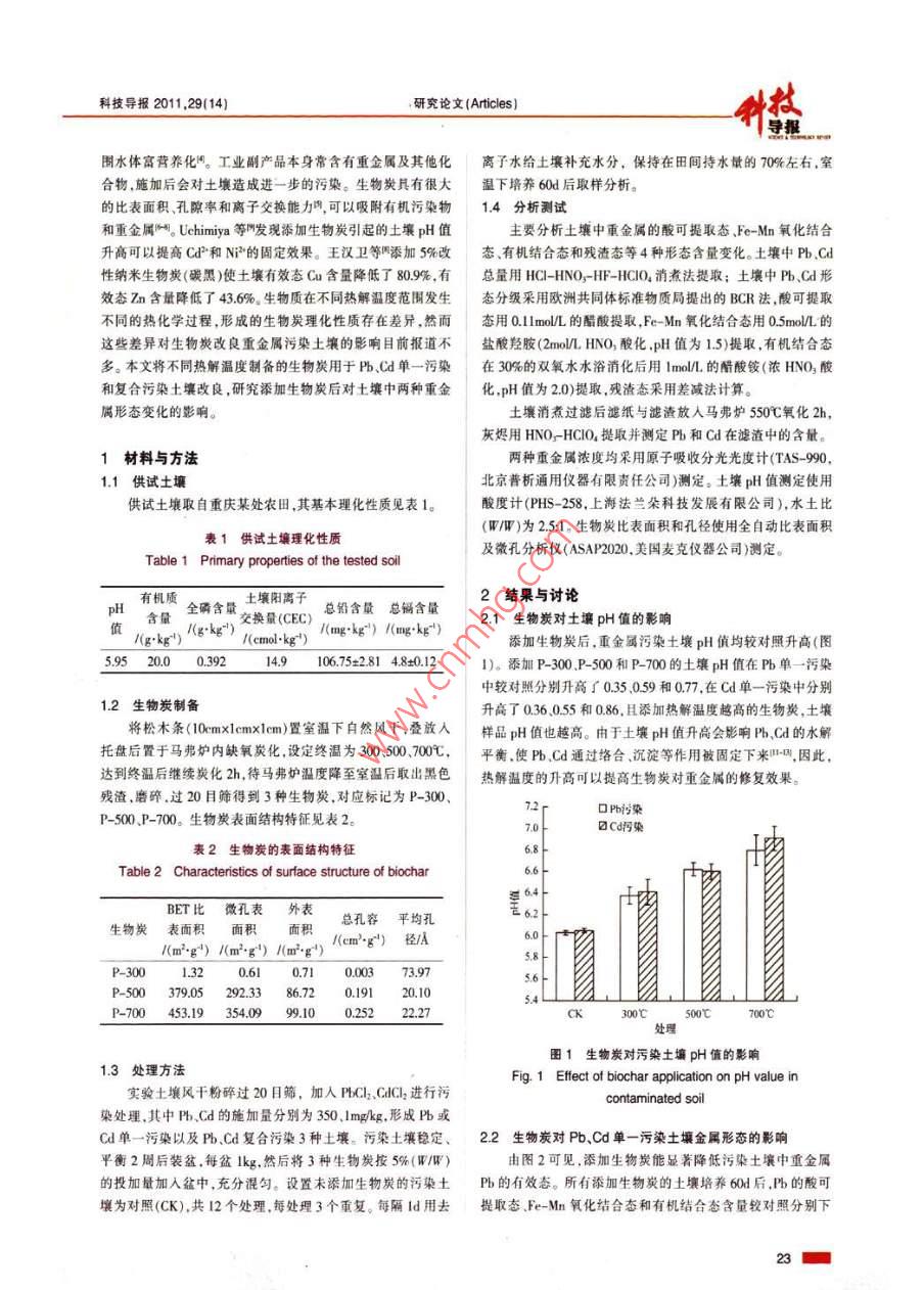 不同热解温度生物炭改良铅和镉污染土壤的研究