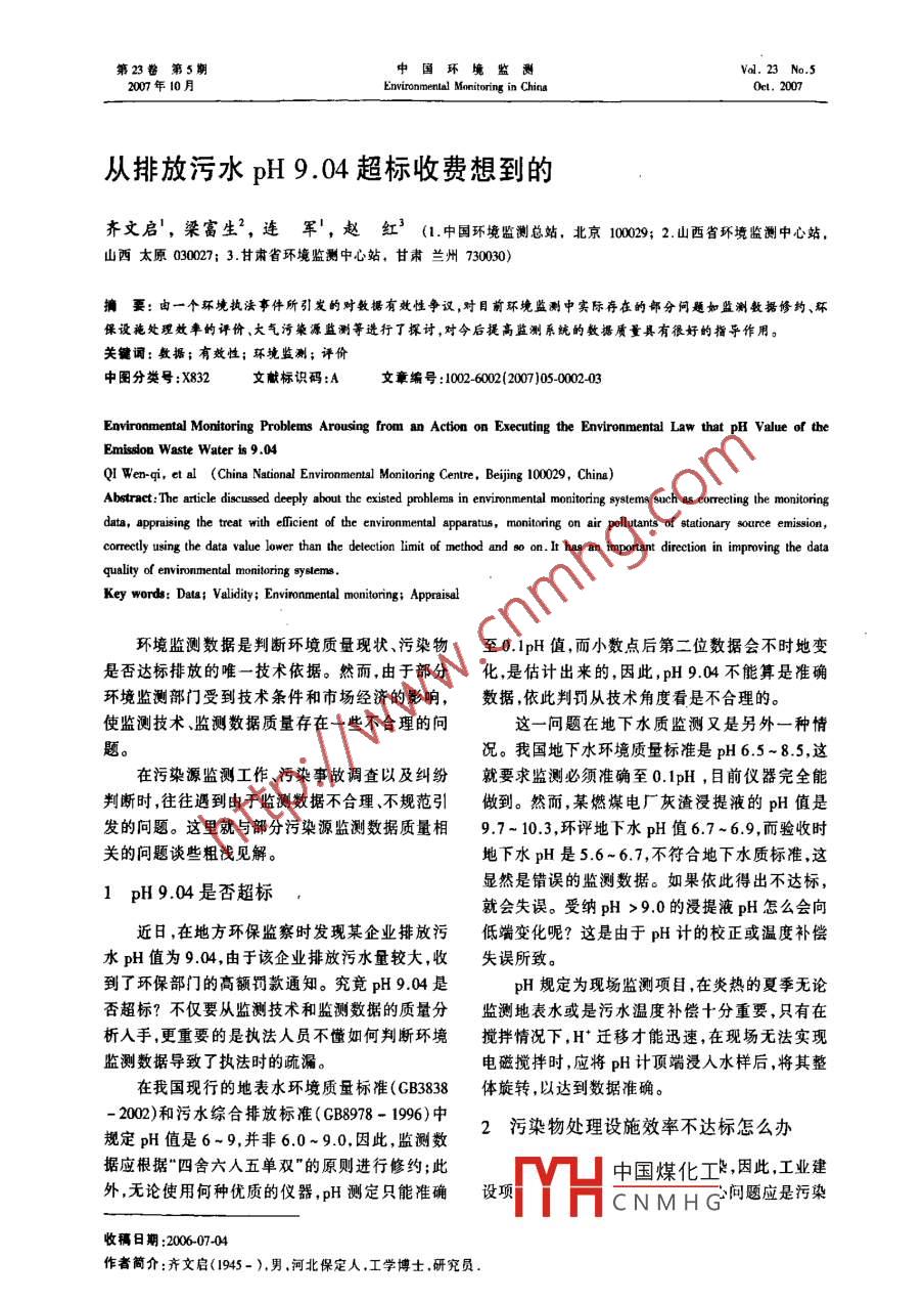 从排放污水pH 9.04超标收费想到的