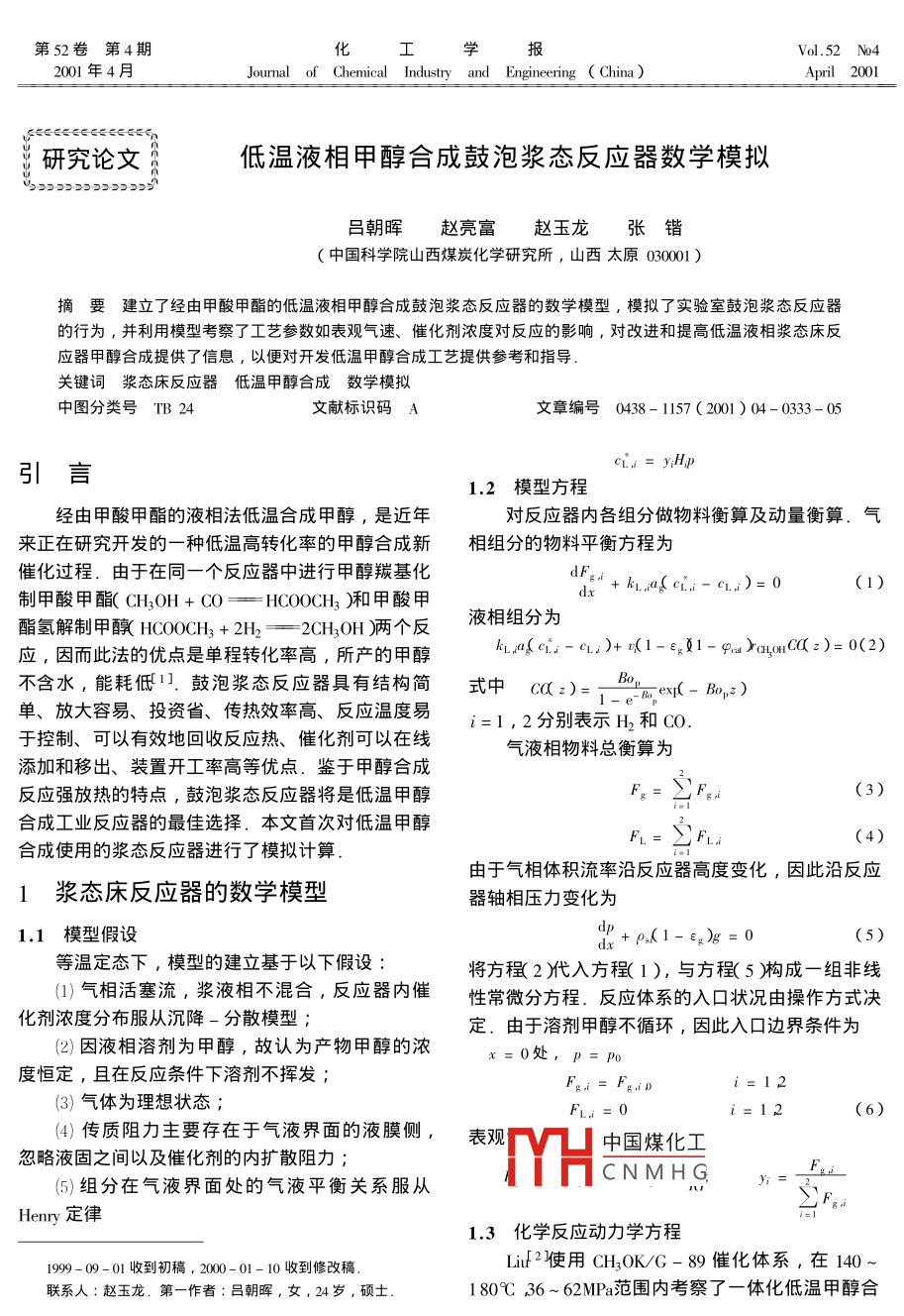 低温液相甲醇合成鼓泡浆态反应器数学模拟
