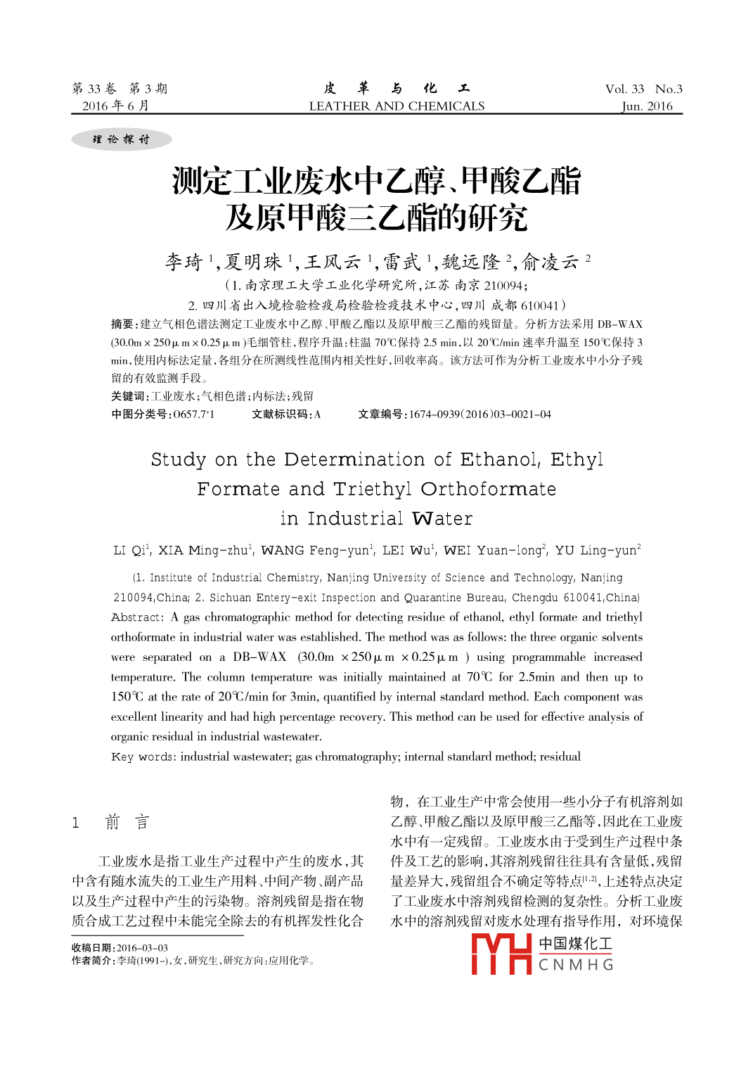 测定工业废水中乙醇、甲酸乙酯及原甲酸三乙酯的研究