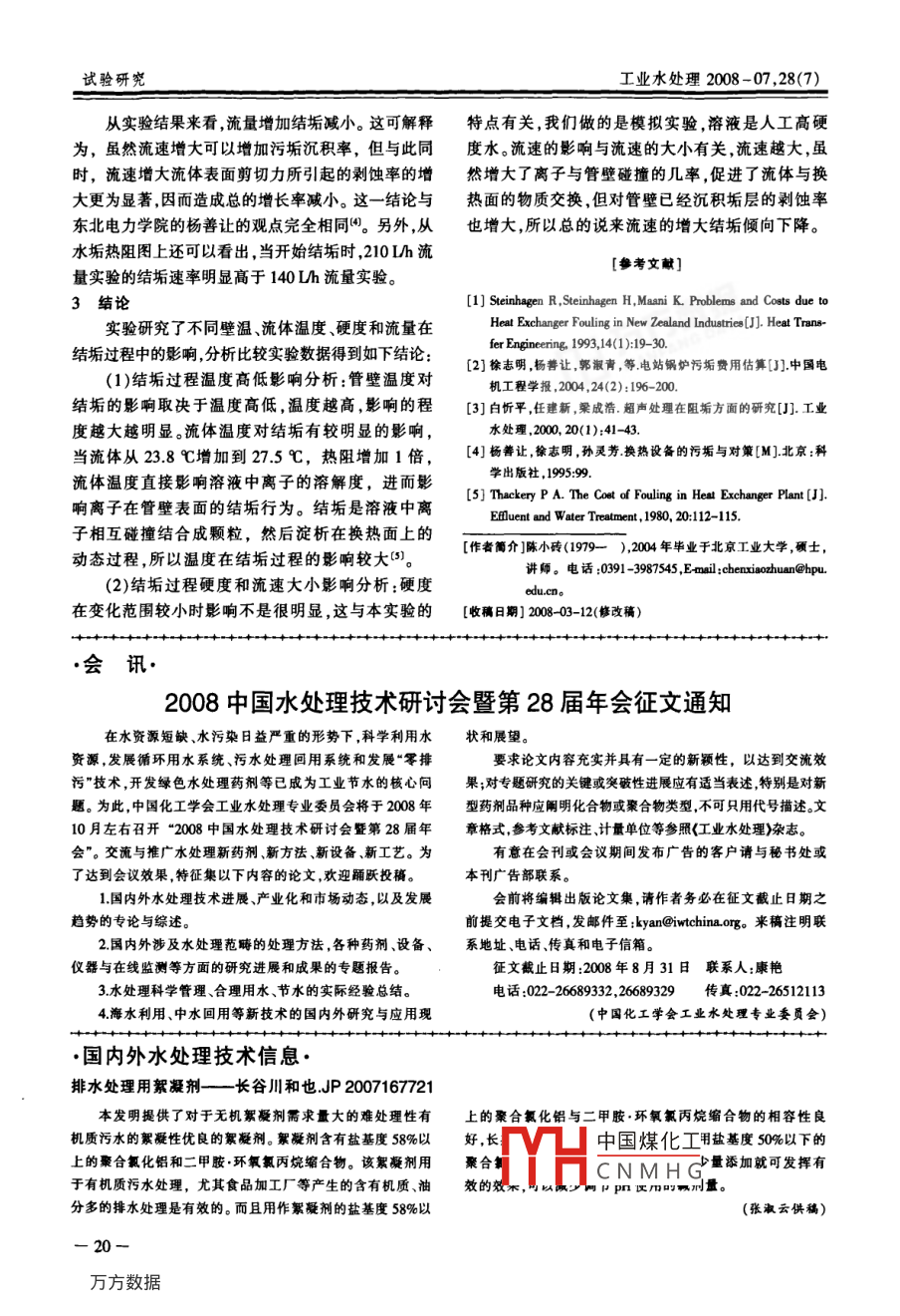 - 期刊名字:工业水处理