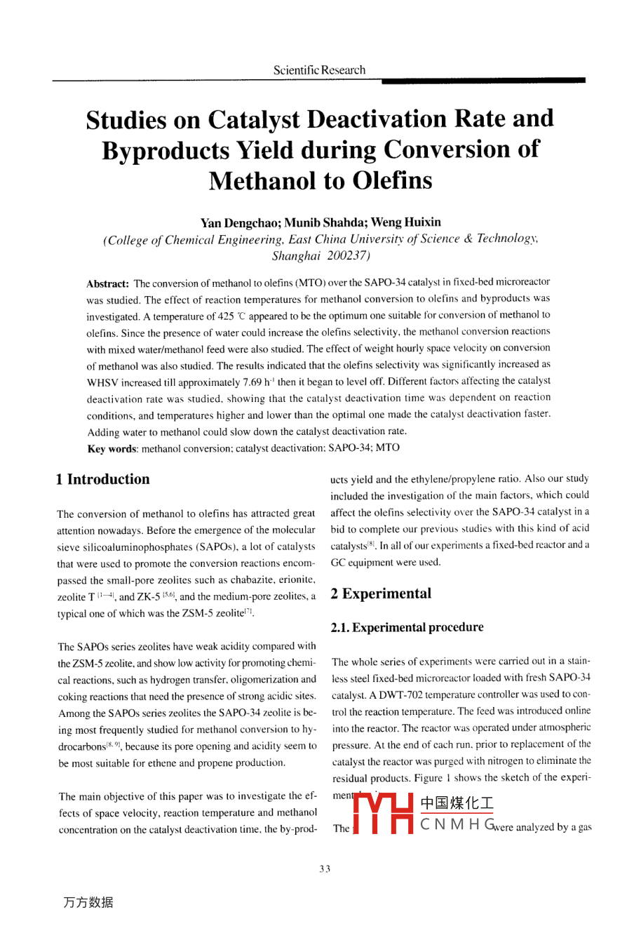 Studies on Catalyst Deactivation Rate and Byproducts Yield during Conversion of Methanol to Olefins