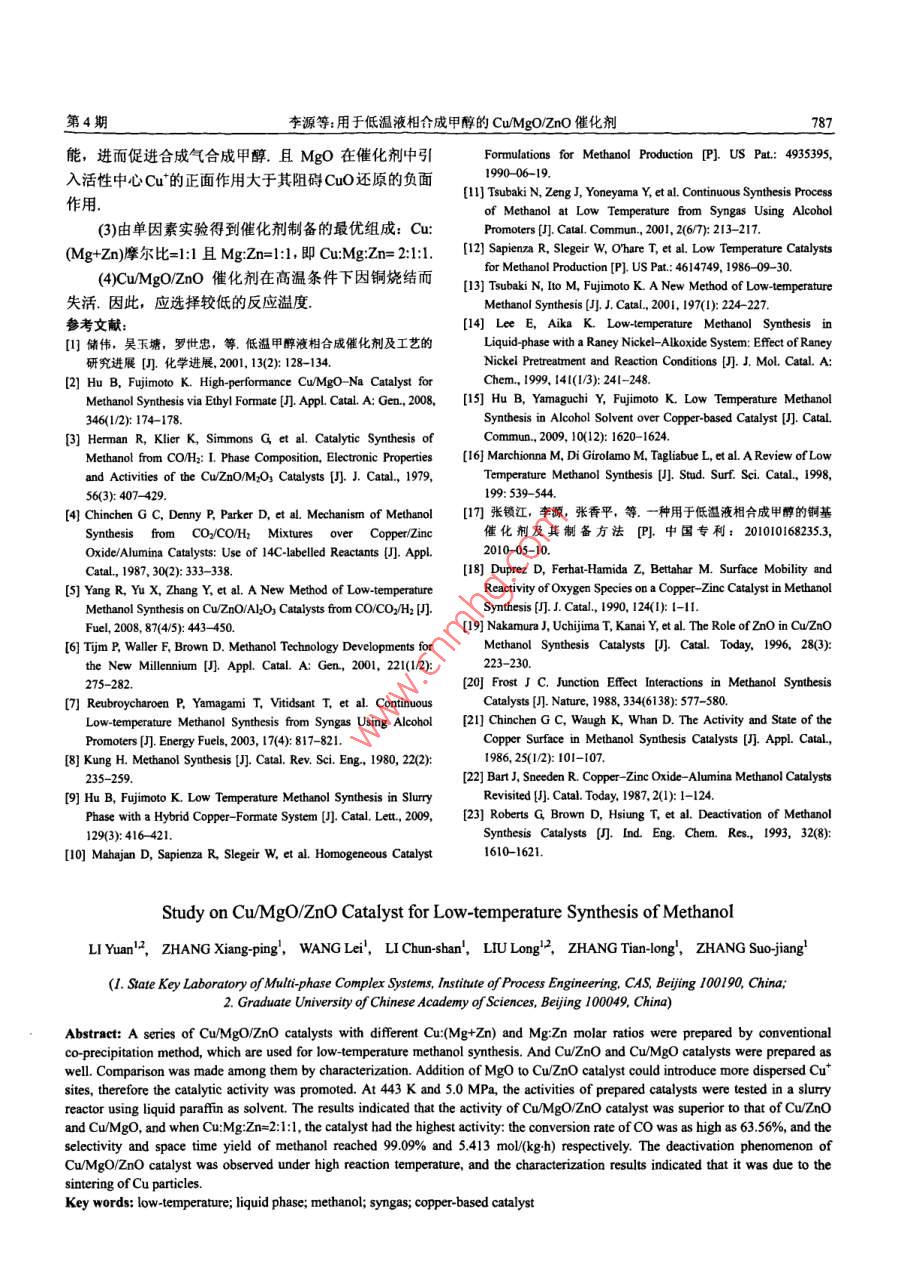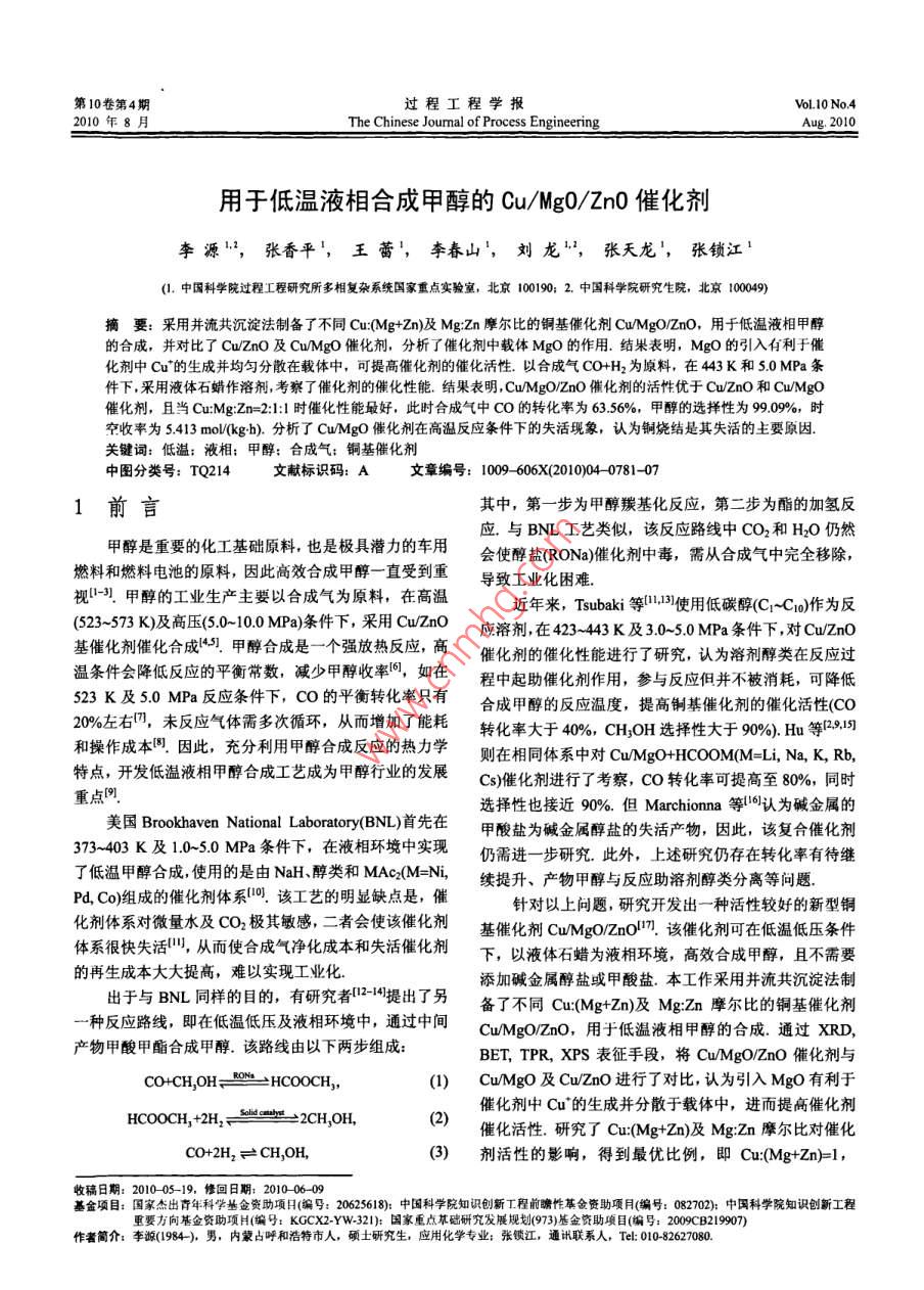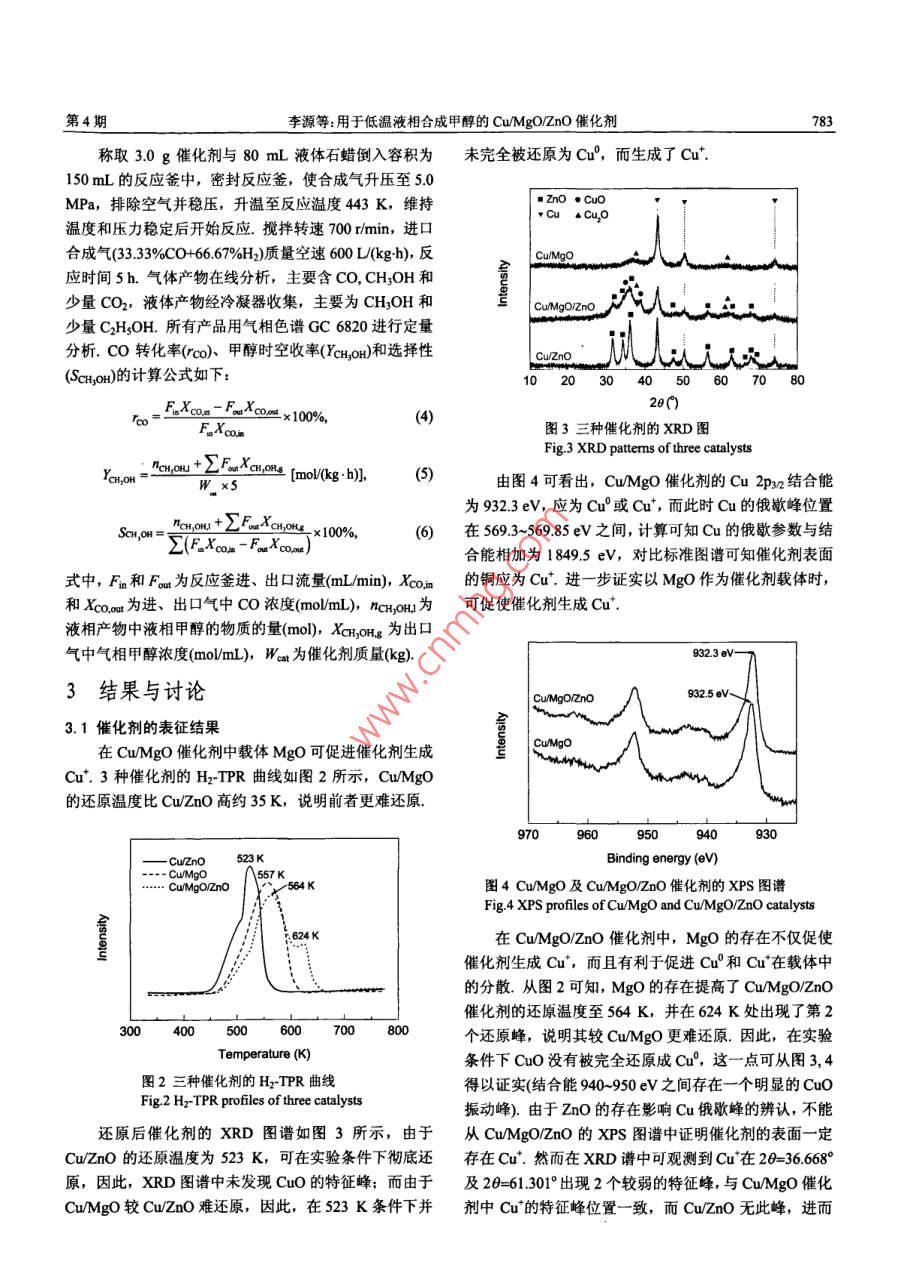 用于低温液相合成甲醇的Cu/MgO/ZnO催化剂