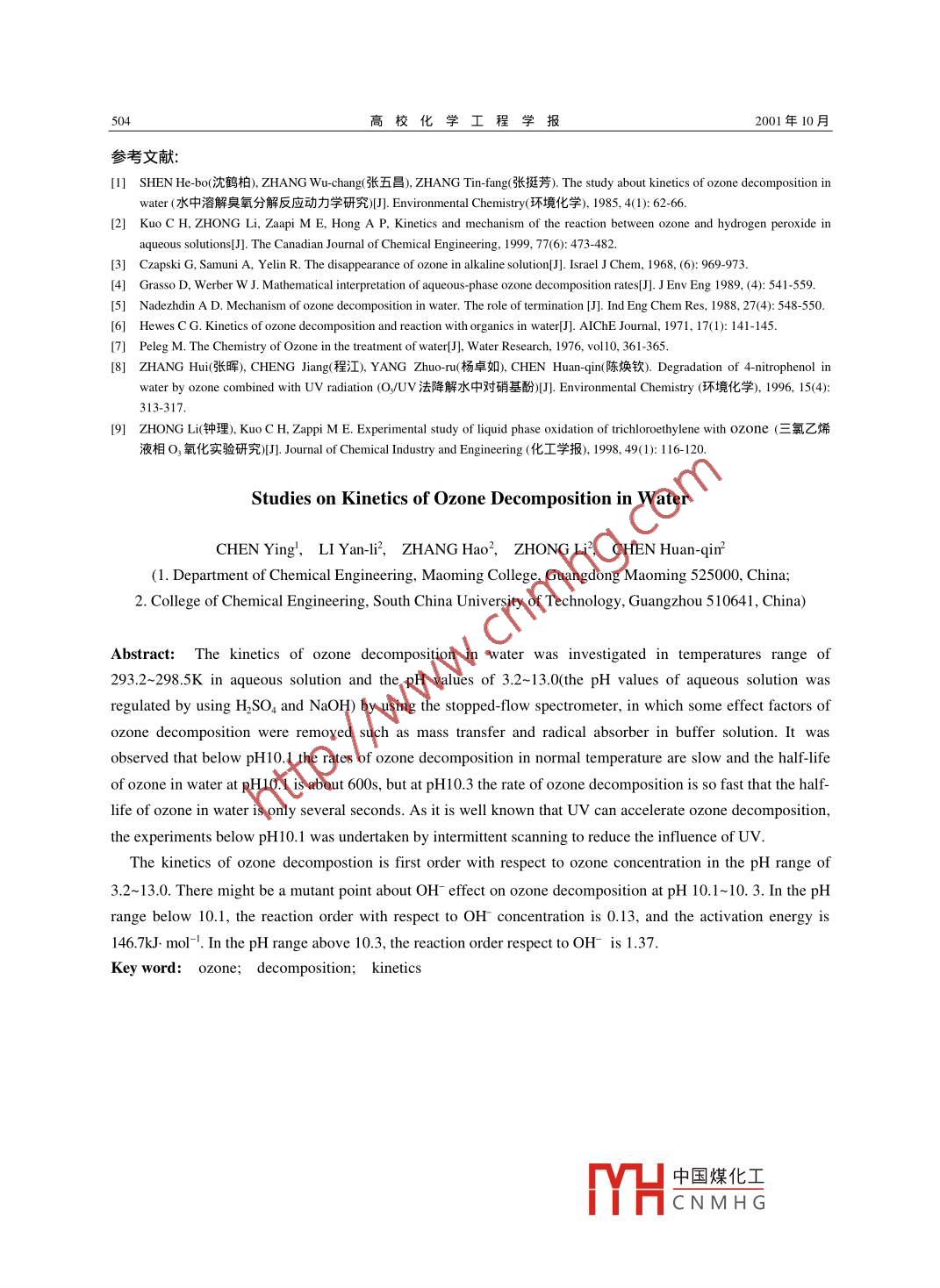 水中臭氧的分解动力学研究