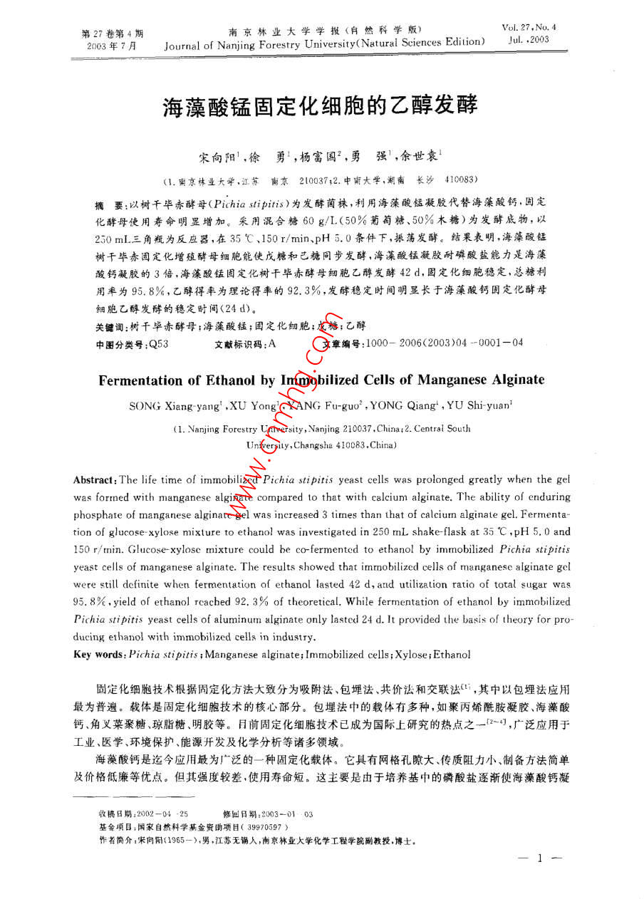 海藻酸锰固定化细胞的乙醇发酵