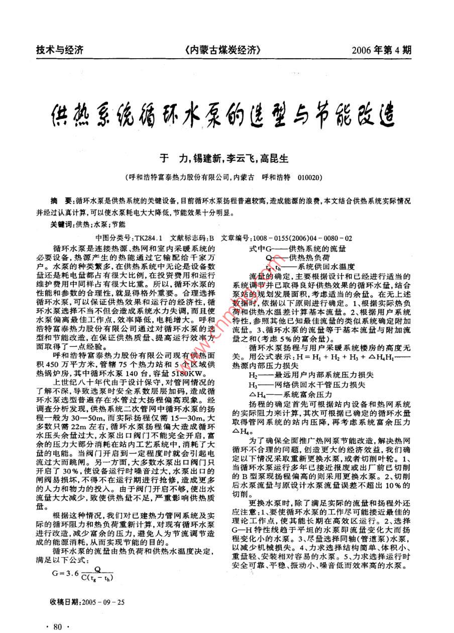 供热系统循环水泵的选型与节能改造