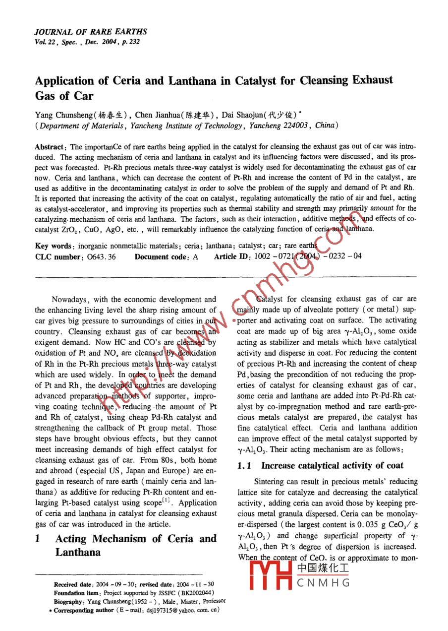 Application of Ceria and Lanthana in Catalyst for Cleansing Exhaust Gas of Car