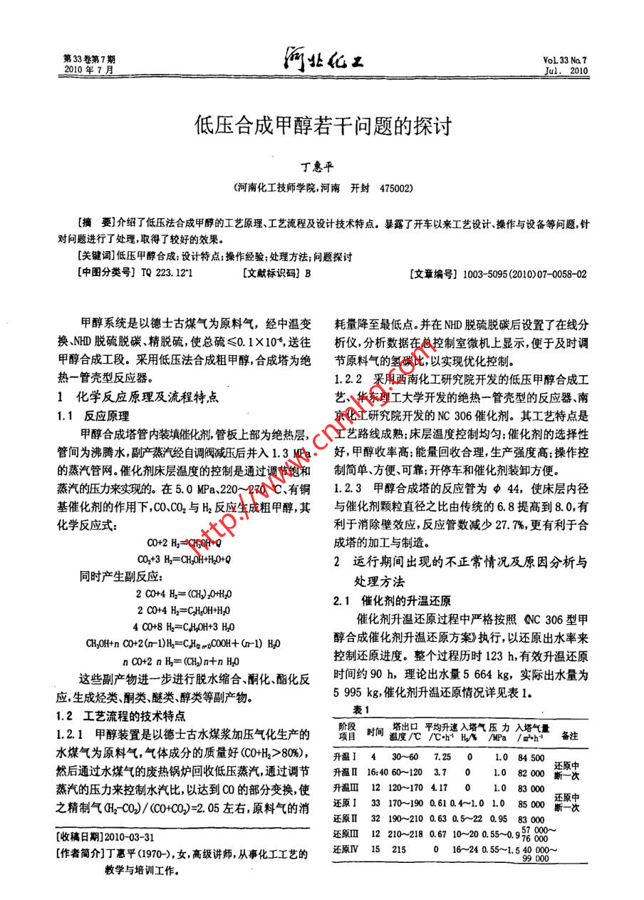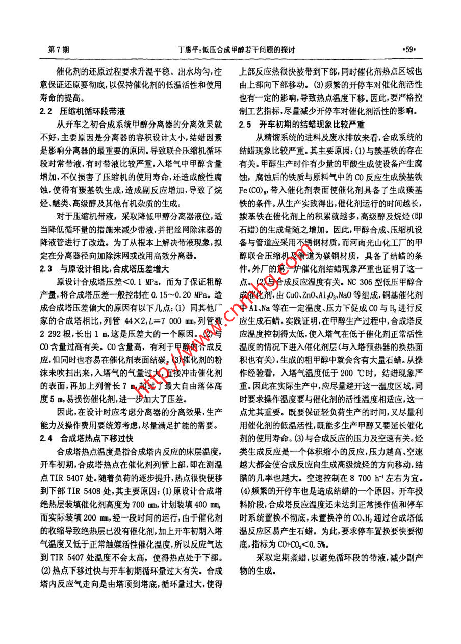 低压合成甲醇若干问题的探讨